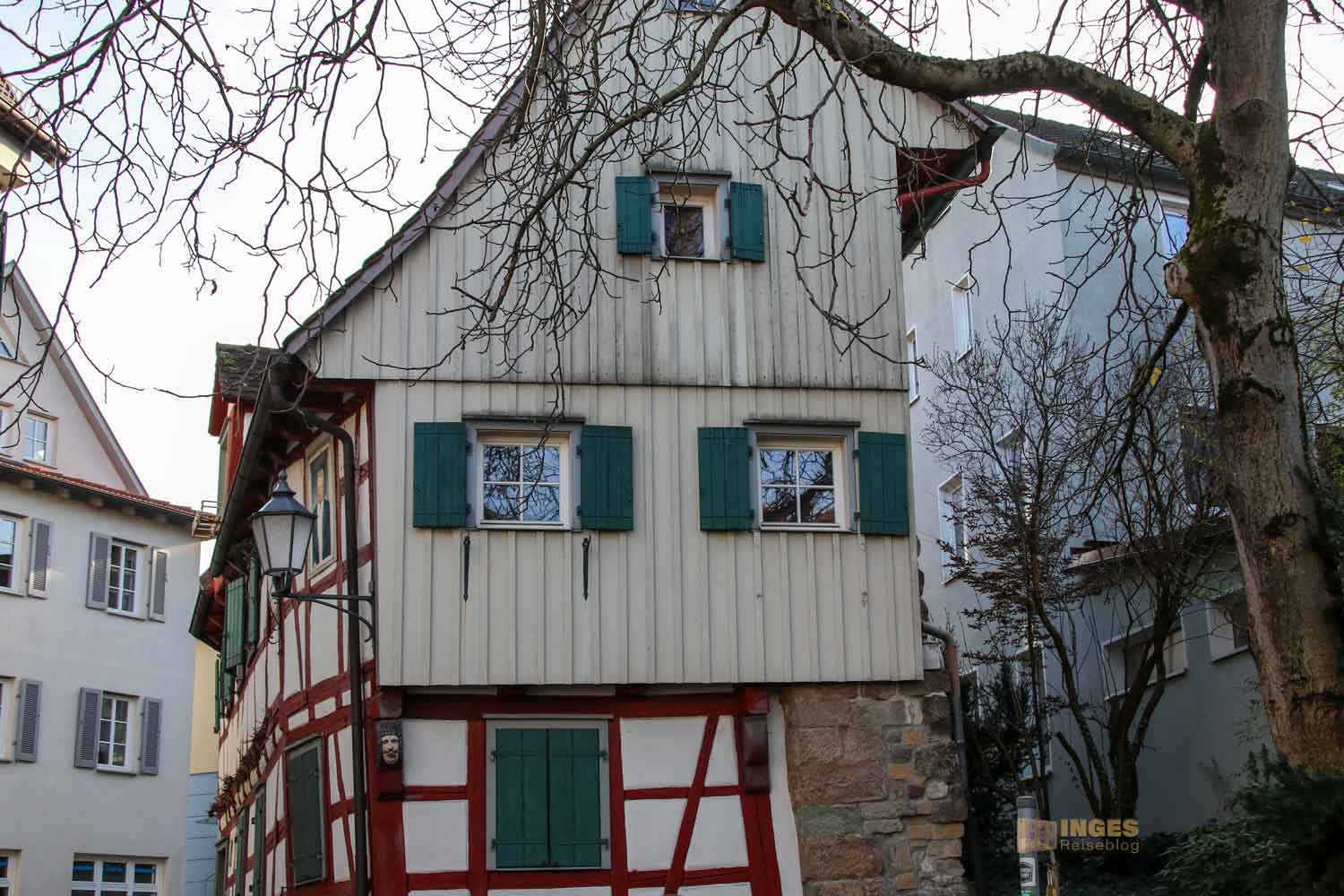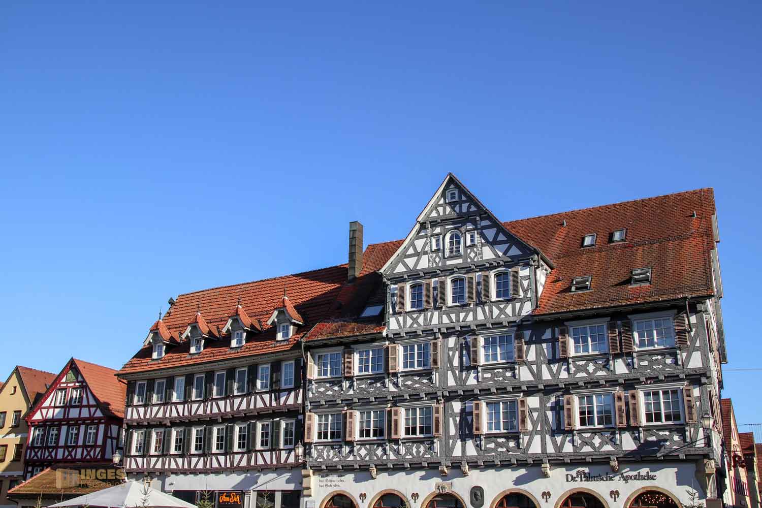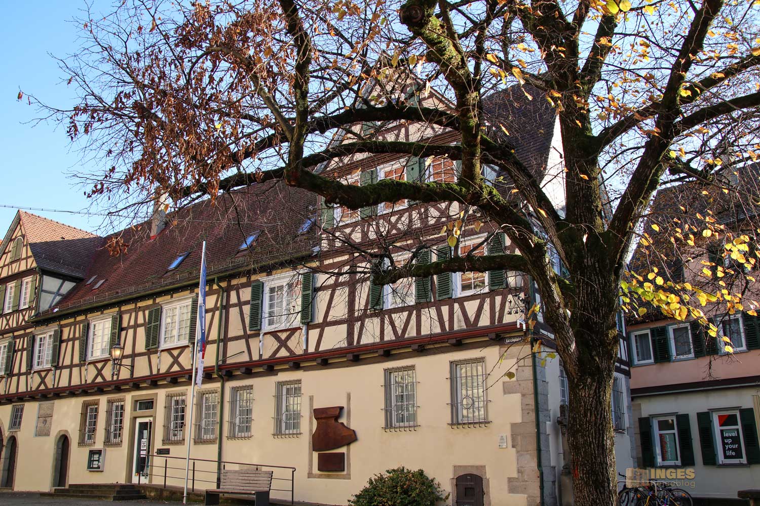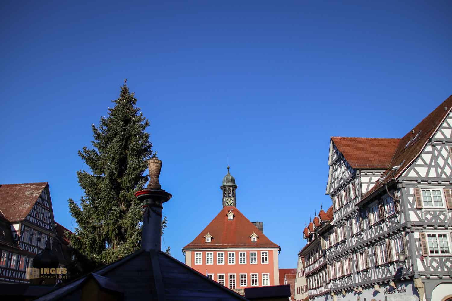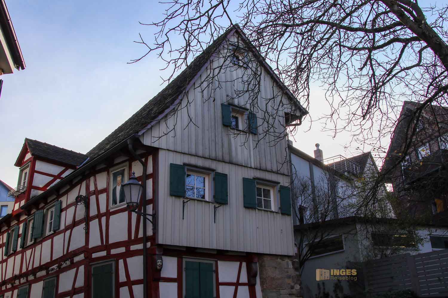 Ihr seht es an den Schattenspielen - wir hatten heute, Ende November, ein traumhaftes Wetter. Zwar kalt, aber herrlich sonnig. So macht es Spass eine Stadt zu 'erobern'. Denn kaum ums Eck Richtung Kirche, erwartet uns das nächste Fachwerk-Ensemble. Unübersehbar auch, dass man sich im Schwabenland befindet, wie man am Wirtshausschild sieht. Eigentlich ist es ja eine Bar. 🙂
