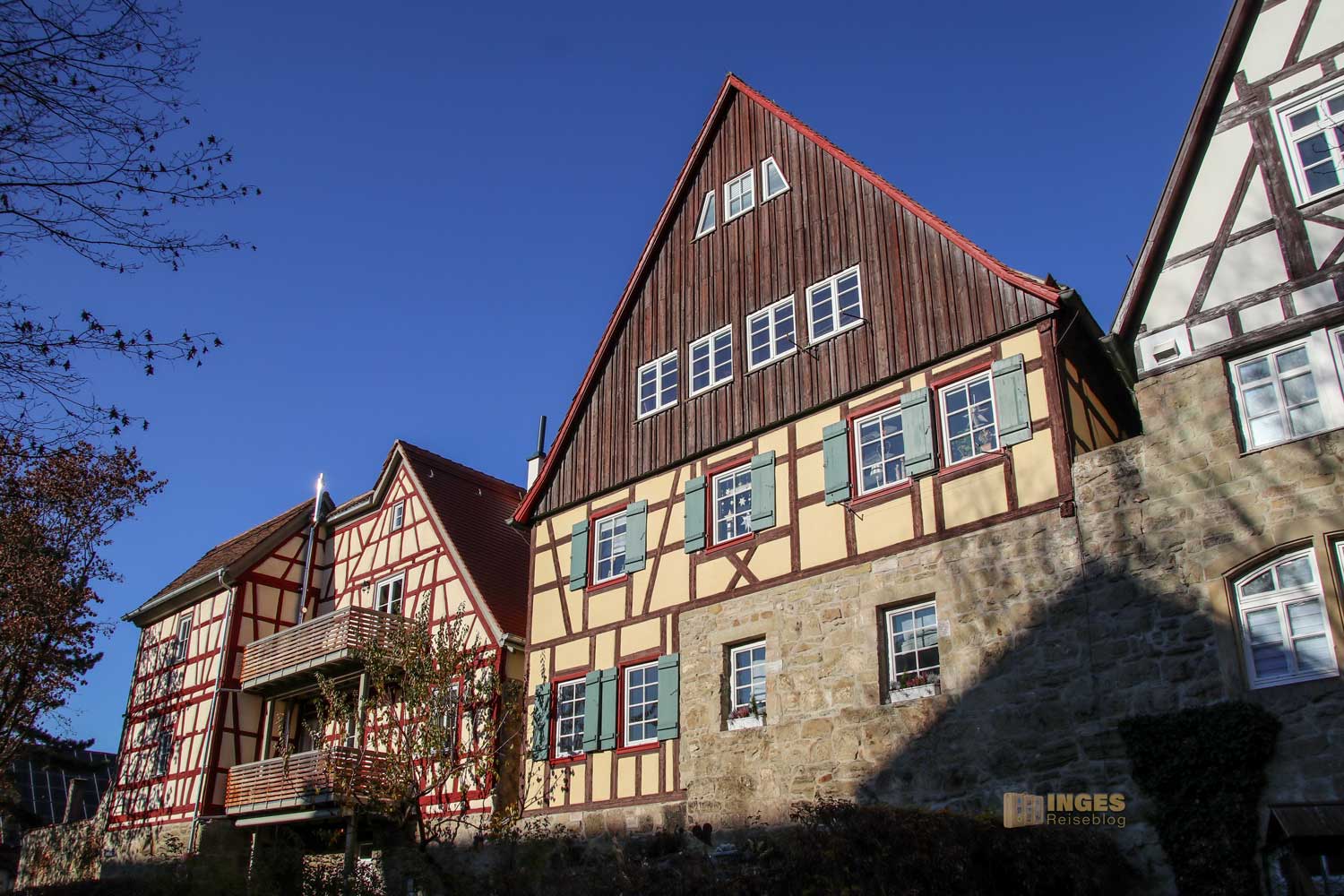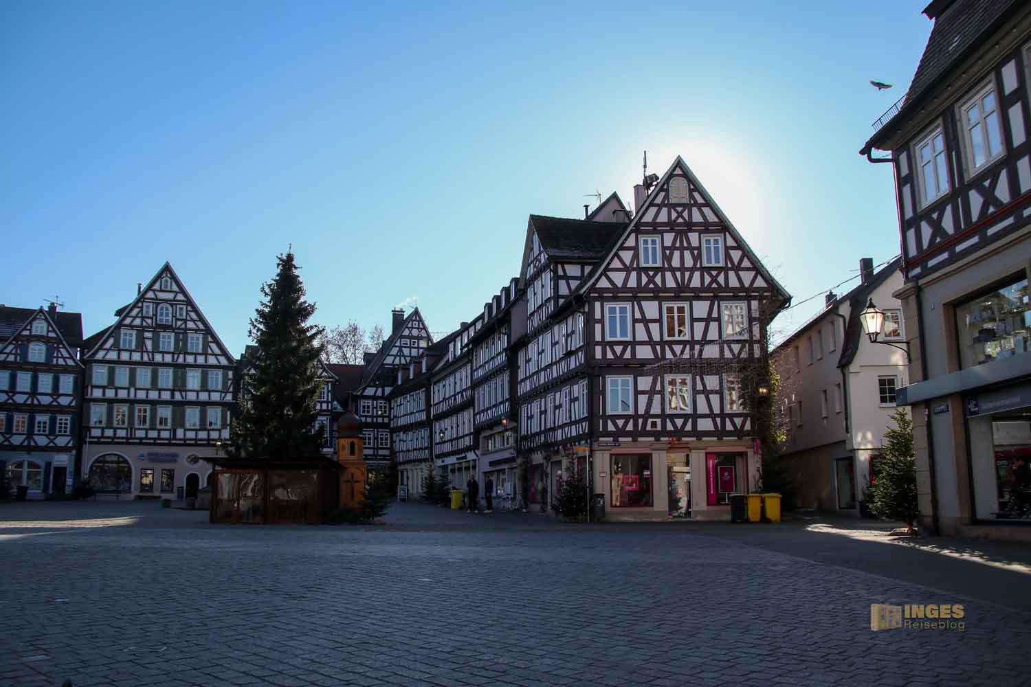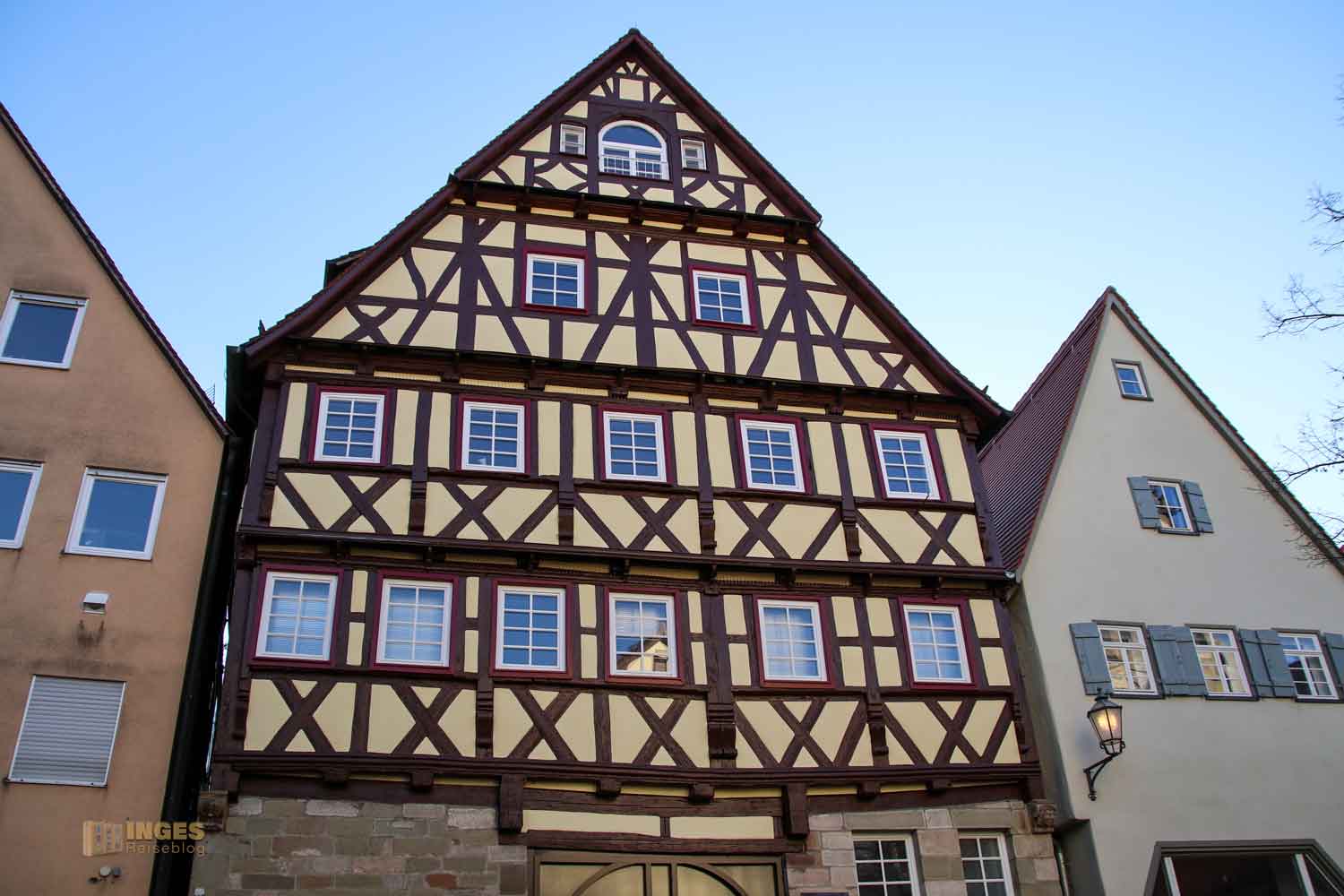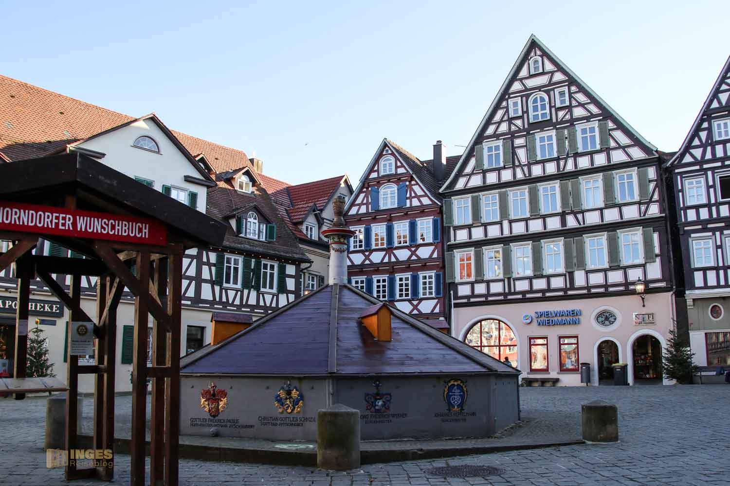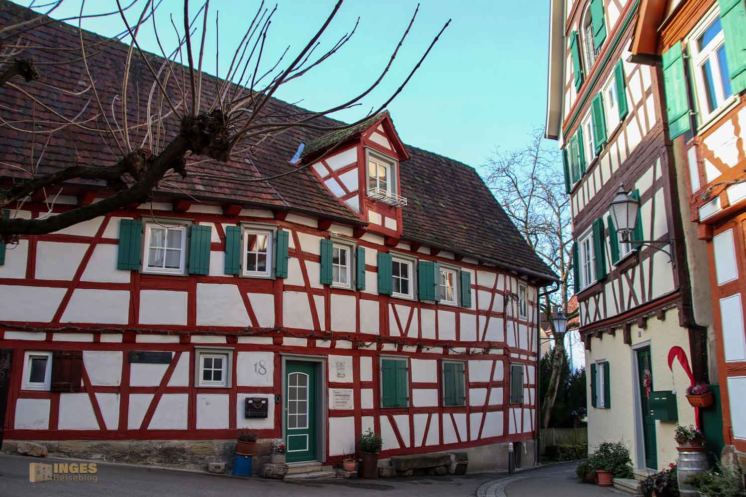 Ihr seht es an den Schattenspielen - wir hatten heute, Ende November, ein traumhaftes Wetter. Zwar kalt, aber herrlich sonnig. So macht es Spass eine Stadt zu 'erobern'. Denn kaum ums Eck Richtung Kirche, erwartet uns das nächste Fachwerk-Ensemble. Unübersehbar auch, dass man sich im Schwabenland befindet, wie man am Wirtshausschild sieht. Eigentlich ist es ja eine Bar. 🙂