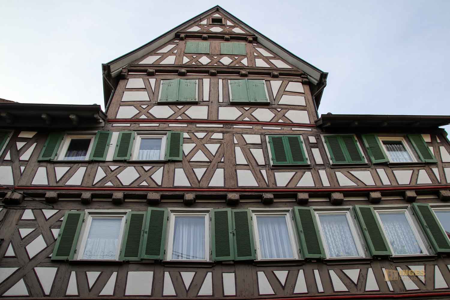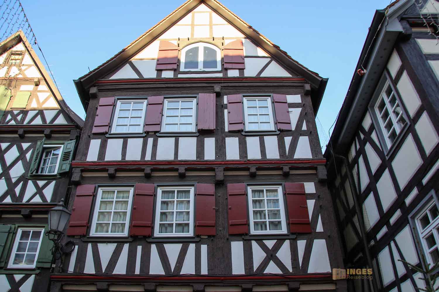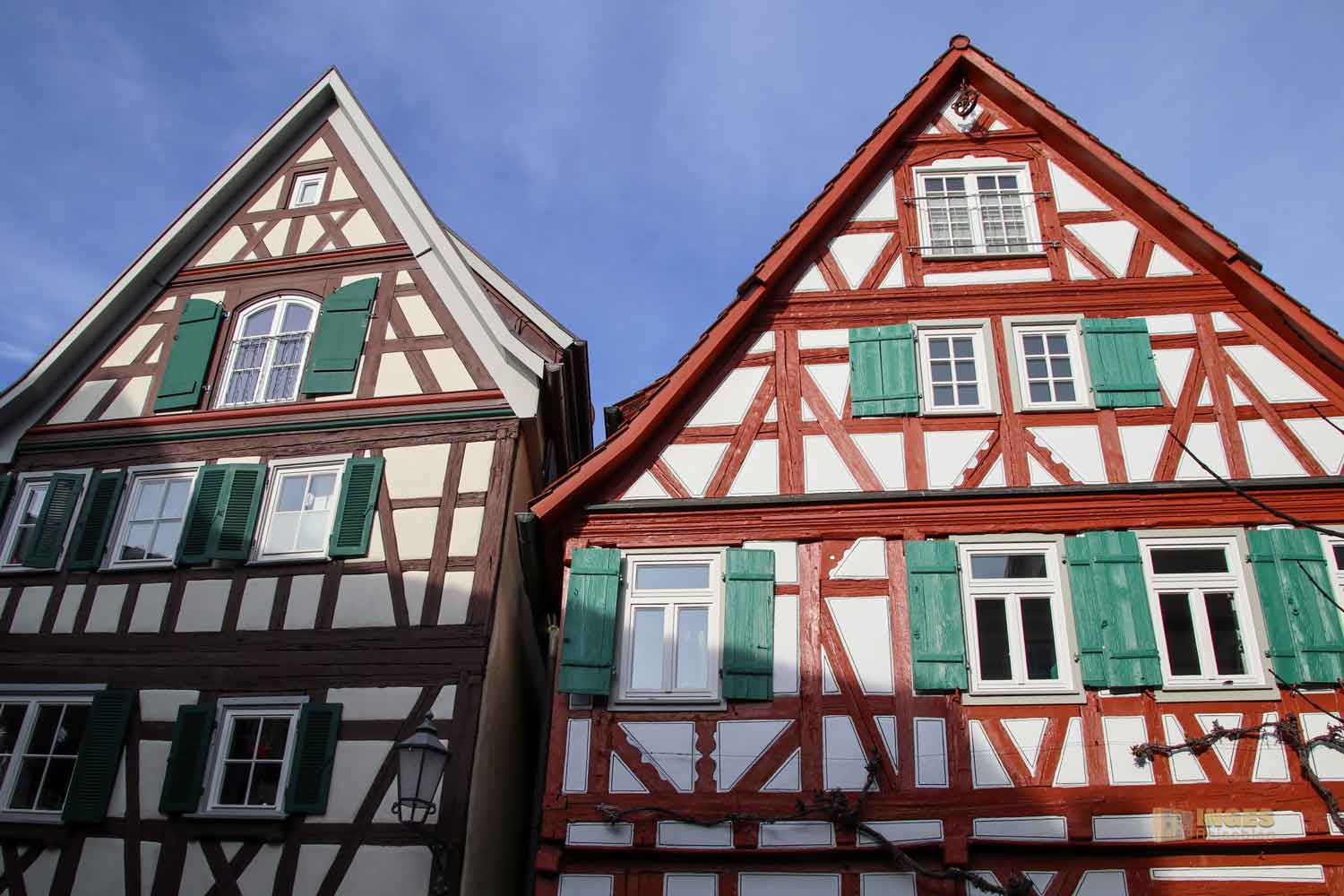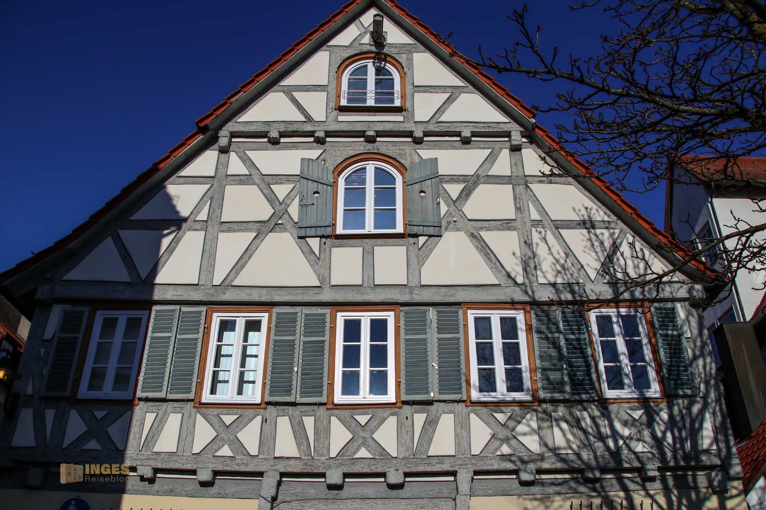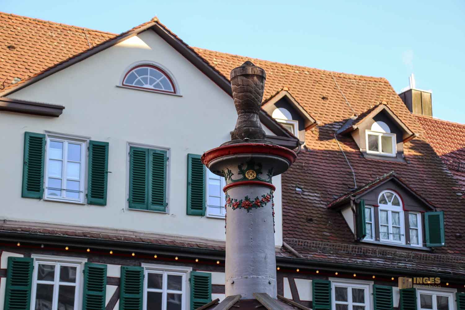 Ihr seht es an den Schattenspielen - wir hatten heute, Ende November, ein traumhaftes Wetter. Zwar kalt, aber herrlich sonnig. So macht es Spass eine Stadt zu 'erobern'. Denn kaum ums Eck Richtung Kirche, erwartet uns das nächste Fachwerk-Ensemble. Unübersehbar auch, dass man sich im Schwabenland befindet, wie man am Wirtshausschild sieht. Eigentlich ist es ja eine Bar. 🙂