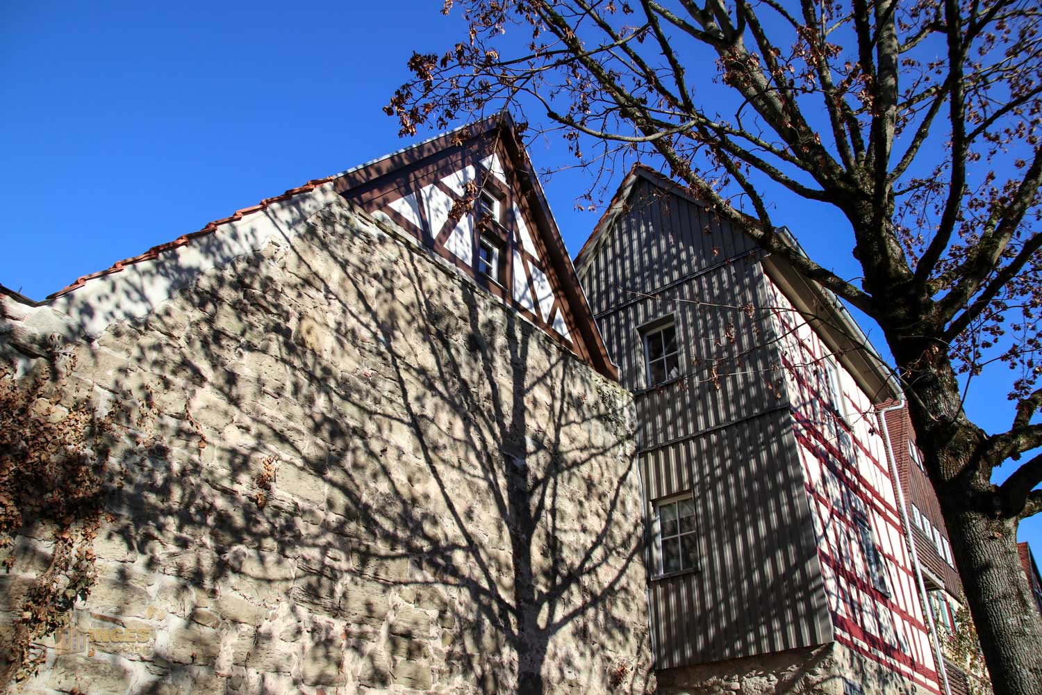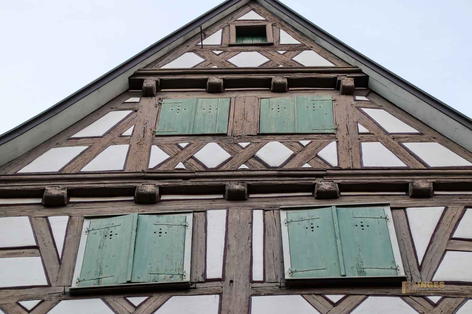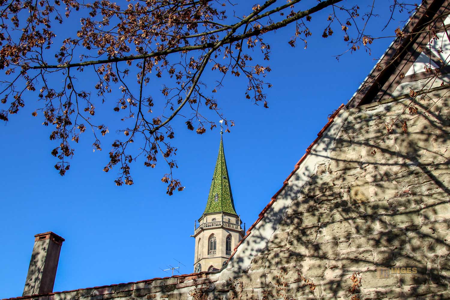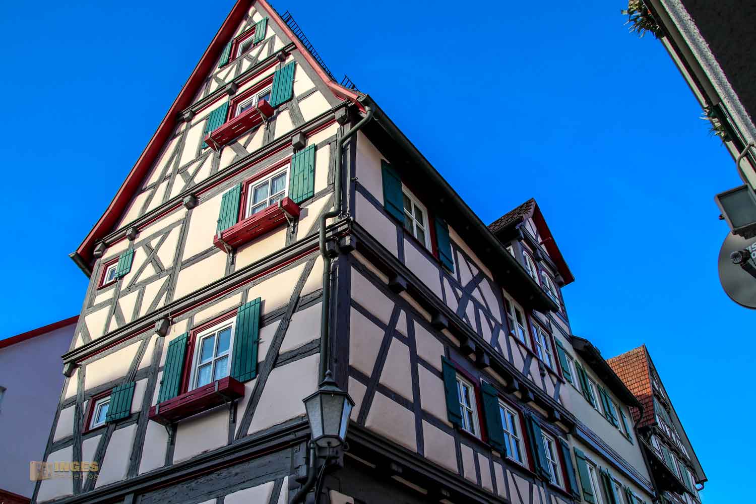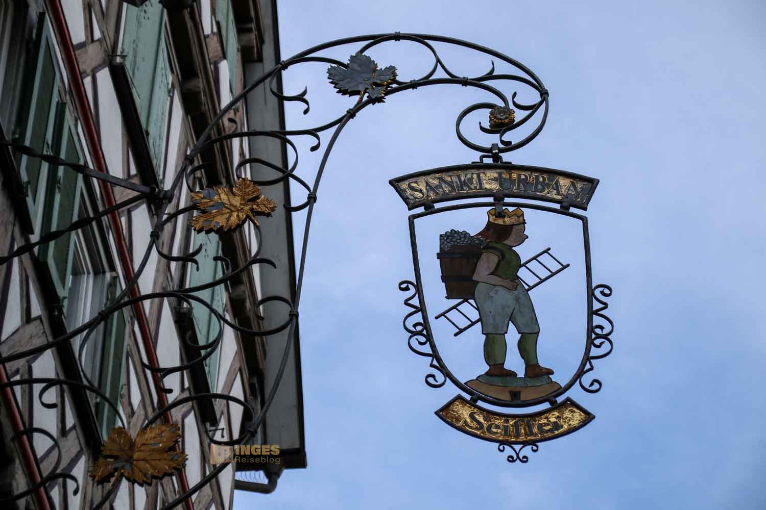 Ihr seht es an den Schattenspielen - wir hatten heute, Ende November, ein traumhaftes Wetter. Zwar kalt, aber herrlich sonnig. So macht es Spass eine Stadt zu 'erobern'. Denn kaum ums Eck Richtung Kirche, erwartet uns das nächste Fachwerk-Ensemble. Unübersehbar auch, dass man sich im Schwabenland befindet, wie man am Wirtshausschild sieht. Eigentlich ist es ja eine Bar. 🙂