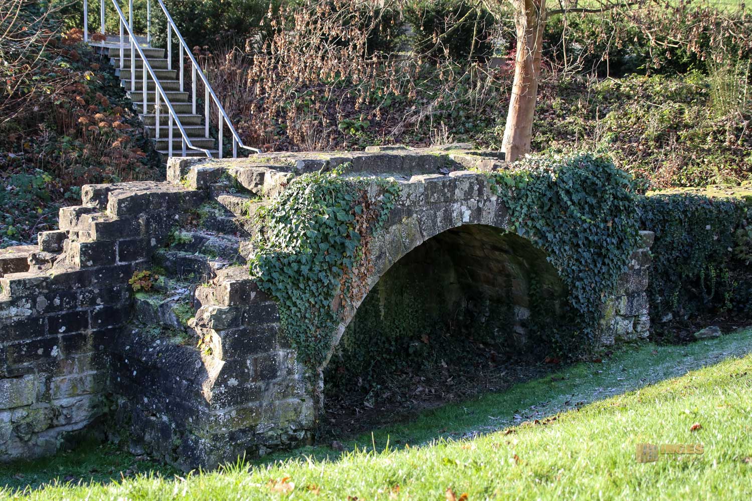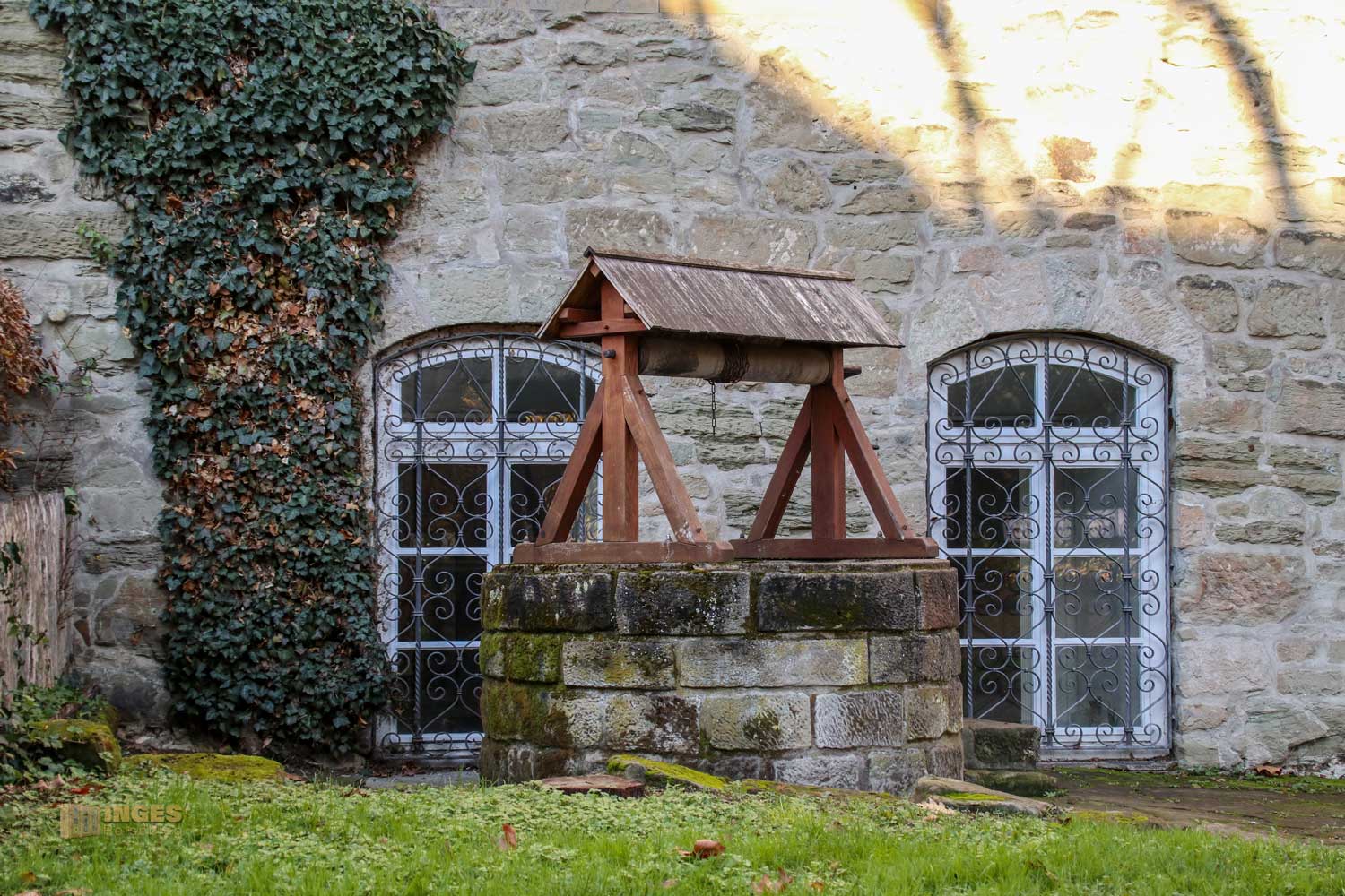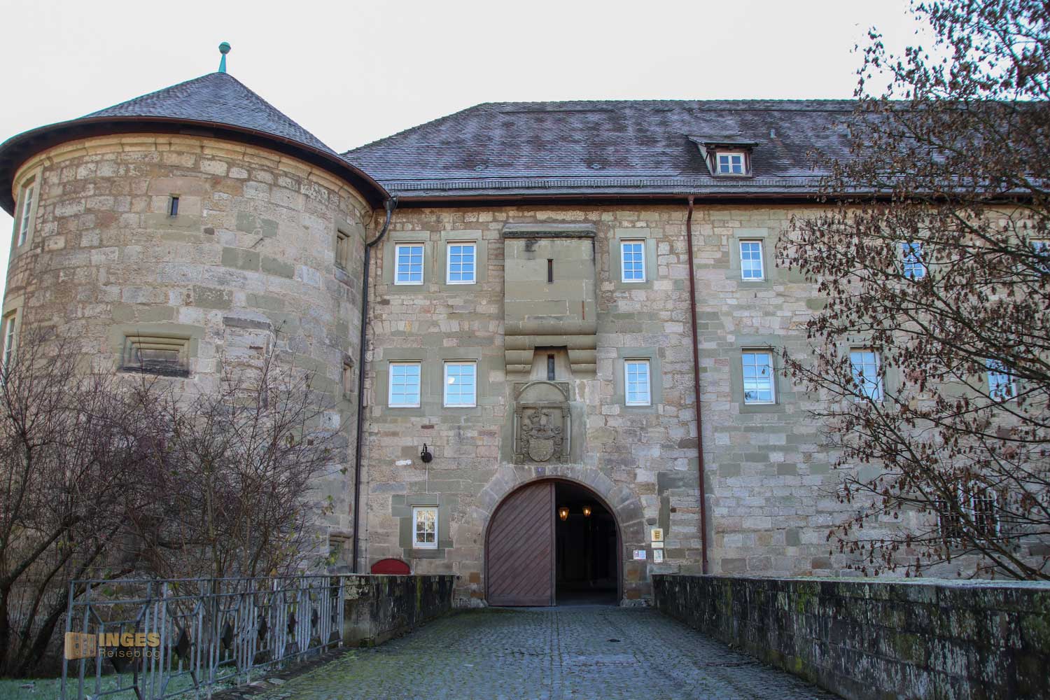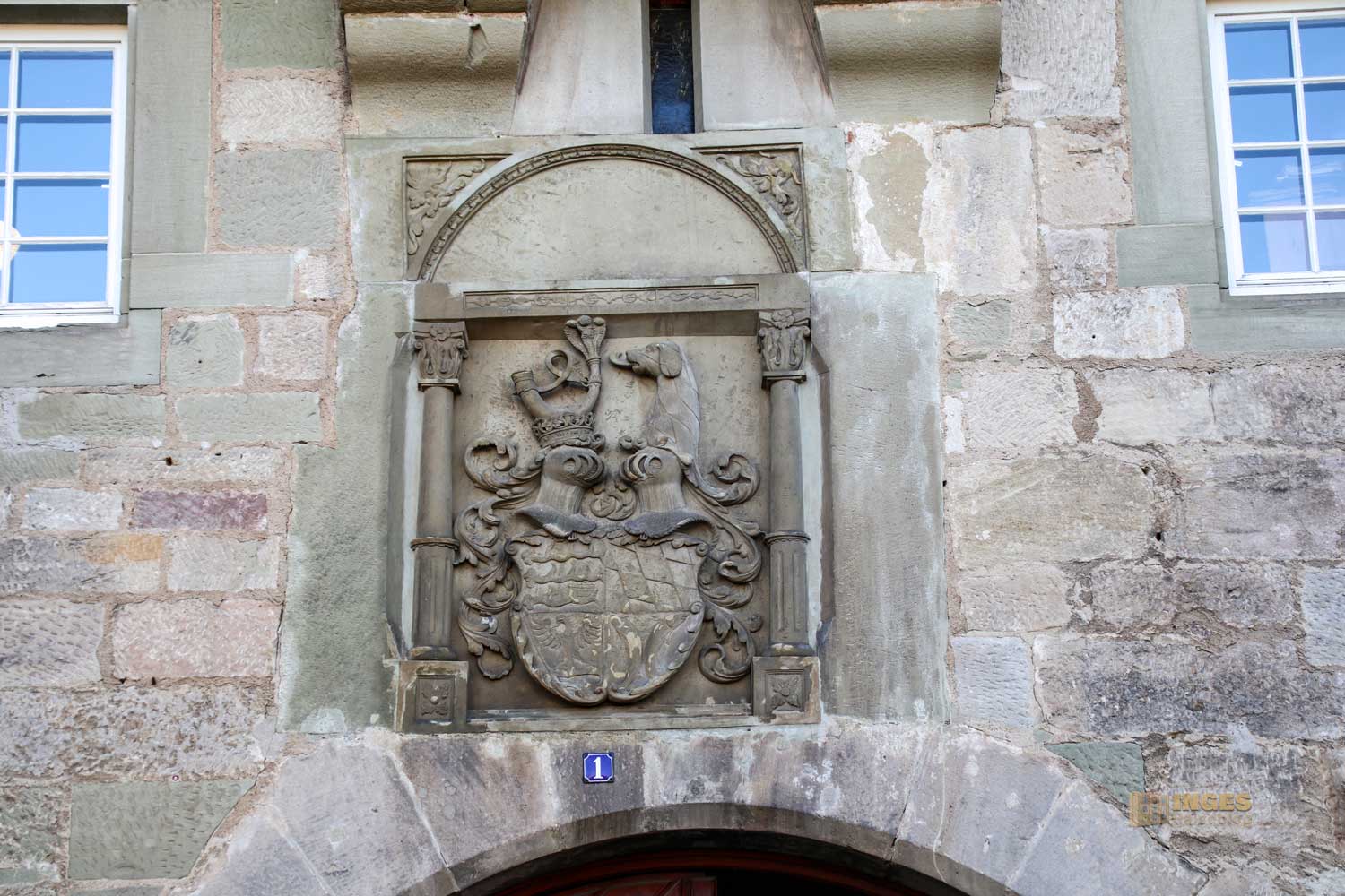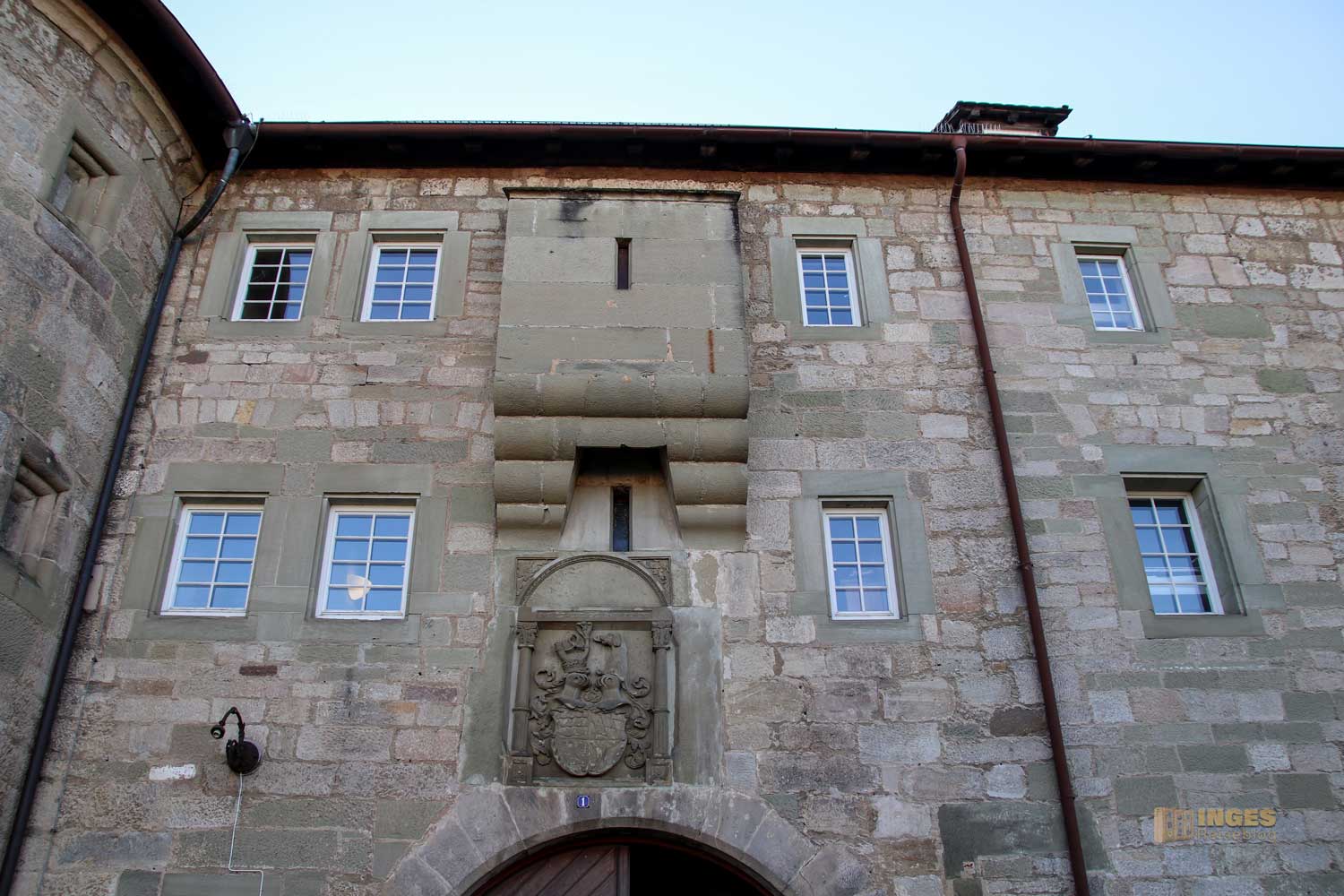 Damit jeder auch weiß, mit welchem Haus er es zu tun hat, darf das Wappen über den Eingängen nicht fehlen. Lange Zeit habe ich verwundert geschaut was denn der kleine Erker über dem Eingangstor zu bedeuten hat. Für eine Toilettenanlage erschien er mir doch wahrlich zu schmal, und dann auch noch über dem Eingangstor? Vielleicht wollte man einem unliebsamen Besucher mit einem Gruß von oben den Besuch vermasseln? Vermasseln ist das richtige Stichwort, aber nicht so wie meine Gedanken sich das gerade ausmalten 😀 Es ist ein Gusserker, über den man durch die Öffnung die unliebsamen Besucher mit Pech übergießen konnte.