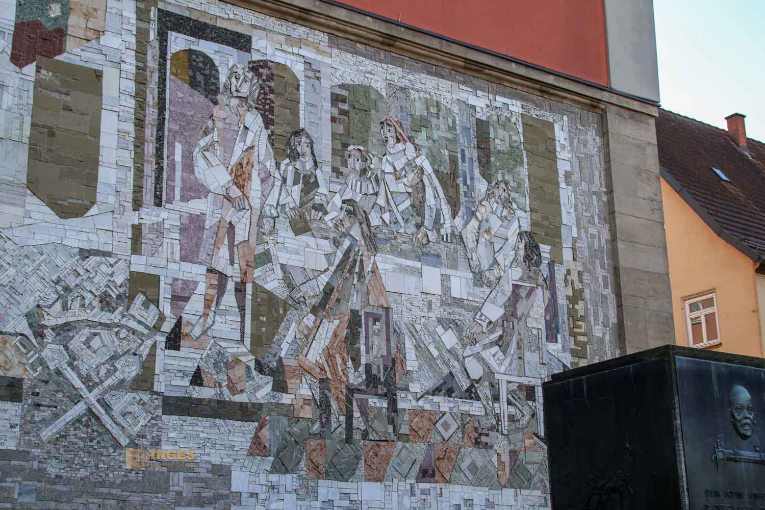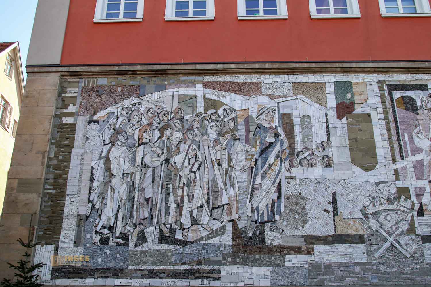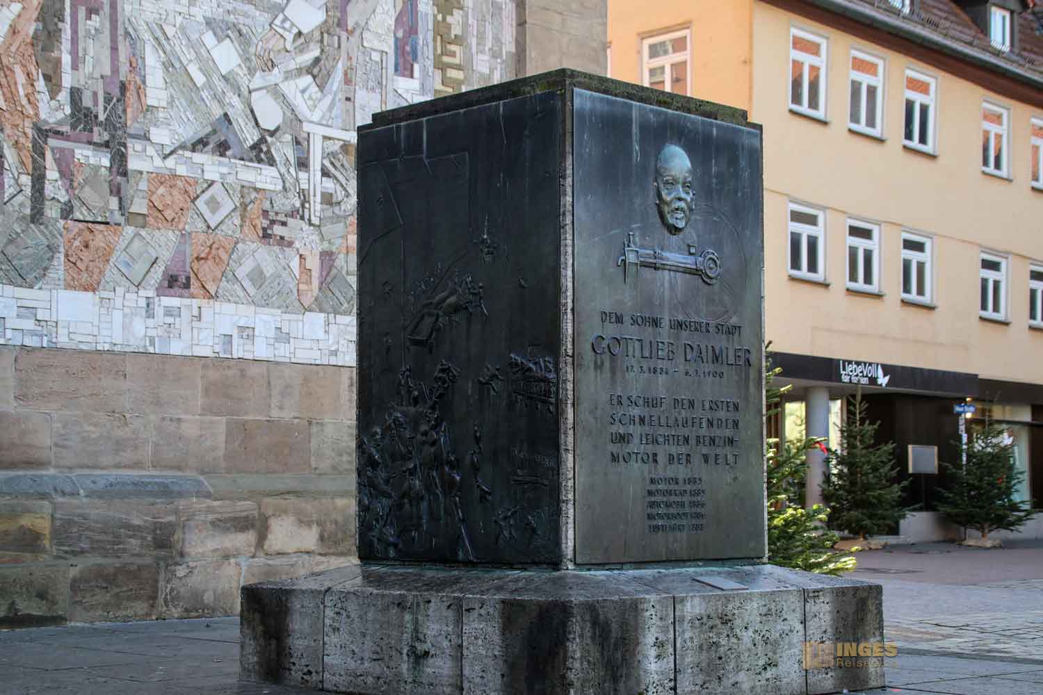 Ihr solltet auch nicht nur die Seite mit dem auffallenden Portal anschauen, sondern auch 'hinter' das Gebäude schauen. 1965 wurden in Mosakibilder die "Schorndorfer Weiber" mit ihrer heldenhaften Tat verewigt. Und noch einer hat an der Stelle einen Ehrenplatz bekommen - Gottlieb Daimler.