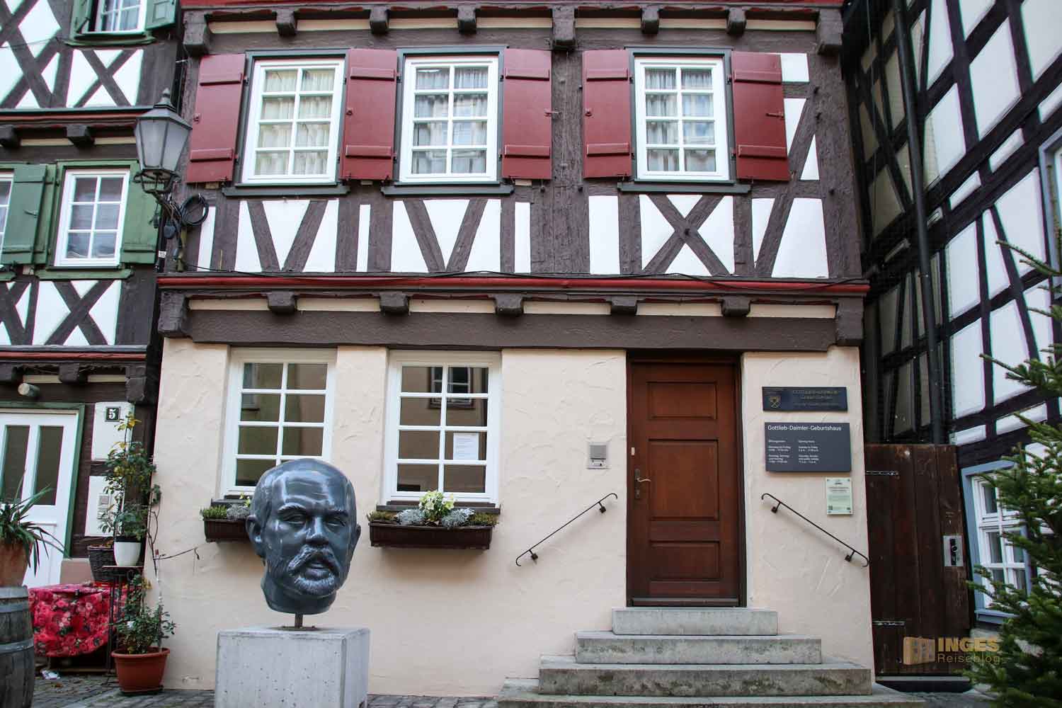 Zurecht ist die Stadt stolz auf ihren Bürger, der am 17. März 1834 in genau diesem Haus das Licht der Welt erblickte. Das Haus ist einiges älter, so ab 1695 wurde mit dem Bau begonnen. Schule und Ausbildung hat er in Schorndorf absolviert und dann bewiesen, dass die Schwaben einfach Käpsele und Cleverle sind 🙂 Er tüftelte, gemeinsam mit Wilhelm Maybach, und sie entwickelten den ersten schnelllaufenden Ottomotor und das erste vierrädrige Auto mit Verbrennungsmotor. Es gäbe noch soviel zu ihm zu schreiben, wollt ihr nachlesen? Dann klickt HIER - und wollt ihr vor Ort entdecken, dann seid ihr im Gottlieb-Daimler-Geburtshaus an der richtigen Stelle. Hier ist ein Museum untergebracht.