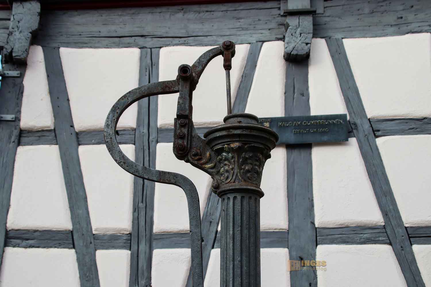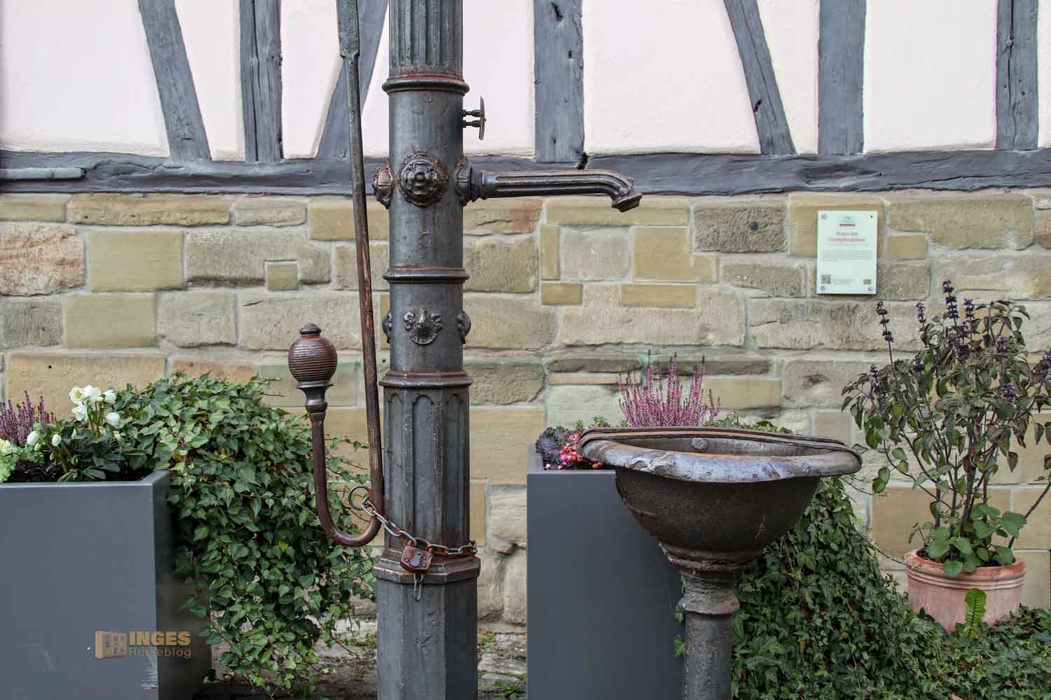 Nur noch einer von neun blieb übrig, dieser gusseiserne Pumpbrunnen vor dem Giebel ist der einzige noch erhaltene aus dem 19. Jahrhundert. Das Haus dahinter ist ein typisches Ackerbürgerhaus, die man in Schorndorf noch öfters findet. In der zweiten Hälfte des 17. Jahrhundert wurdes dieses hier erbaut. Ackerbürger sind Bürger einer Stadt, die Ländereien im Nebenerwerb bewirtschafteten. Üblicherweise wurden diese Gebäude eher an den Stadtrand gestellt, also so wie hier in Schorndorf an die Stadtmauer, so dass der Landwirt mit seinen Wägen gut an sein Haus kam. Aber eigentlich sind diese Häuser genauso wie alle anderen Häuser auch.