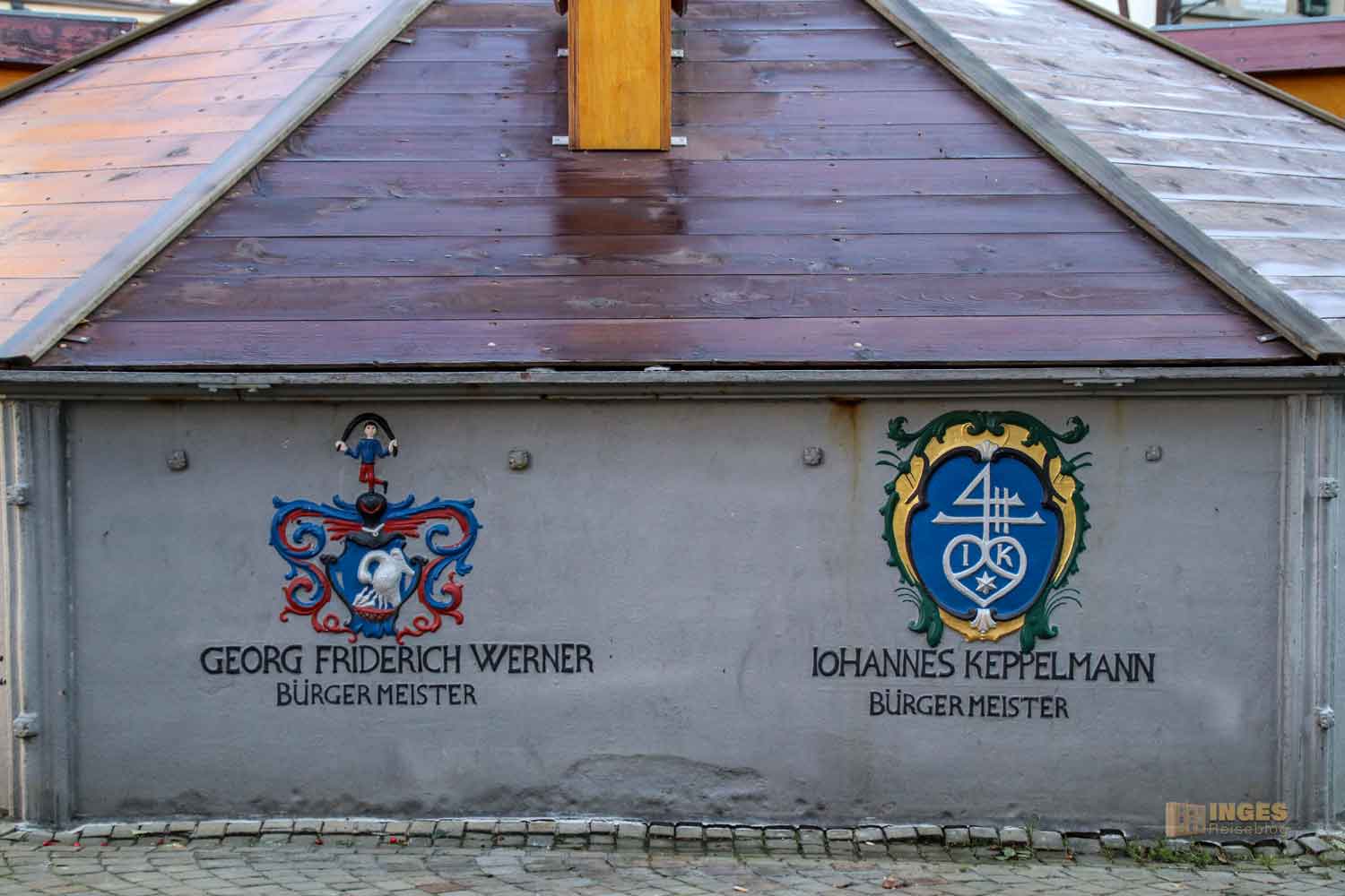 1773 wurde der Marktbrunnen dann gusseisern, Ulrich musste verschwinden und machte einer Säule mit Blumenschmuck Platz. Rings am Brunnen wurden die Wappen der Stadt und des Landesherren verewigt - und natürlich auch die der Stadtoberhäupter.