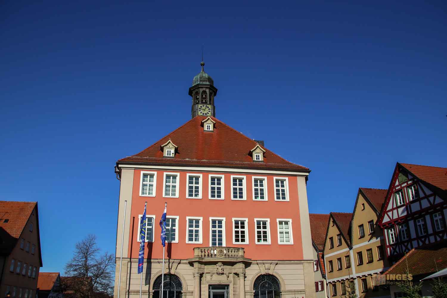 das in vier Jahren Bauzeit ab 1726 seinen Standort auf dem Marktplatz fand. Erinnert ihr euch noch, wie ich weiter oben schrieb - ein großer Graben trennte die Unter- und Oberstadt und wurde irgendwann aufgefüllt? Genau dieser aufgefüllte Graben ist heute der Marktplatz. Der Vogängerbau fiel, wie die weitere Stadt, dem großen Brand 1634 zum Opfer. Eigentlich fällt das neue Gebäude ja irgendwie (wie ich finde) ein bisschen aus dem üblichen Stadtbild für Schorndorf. Der Bau hat einen barocken Touch und sein Baumeister hat sich da ein bisschen von seinem Bau des Ludwigsburger Schlosses inspirieren lassen. Also so gar kein Fachwerkgebäude, wie man sie sonst in Schorndorf reichlich findet.