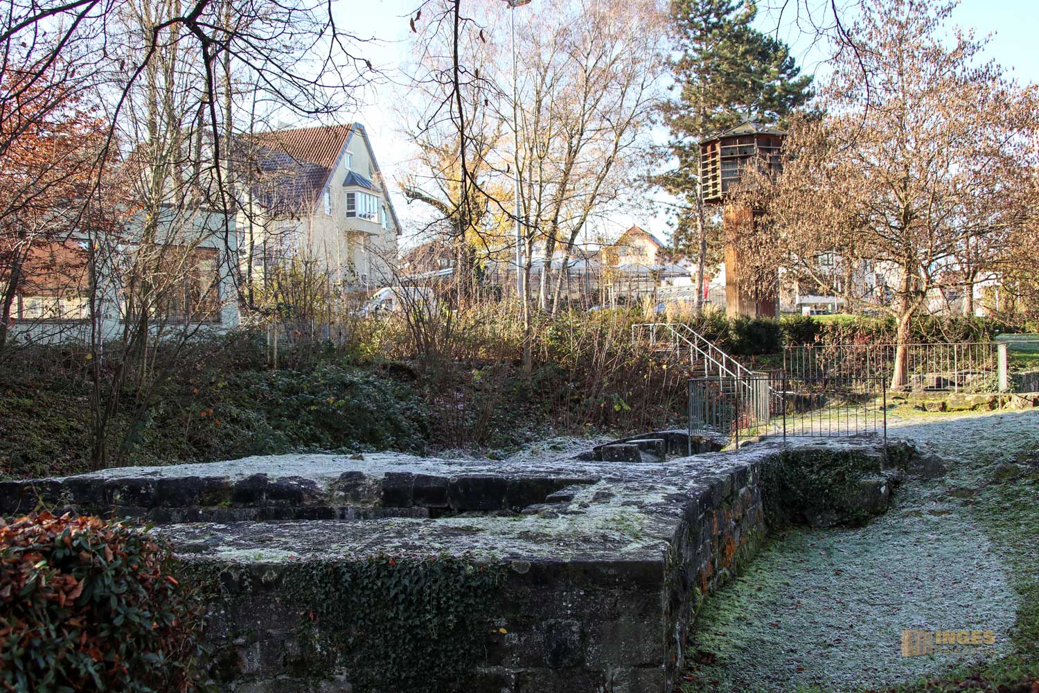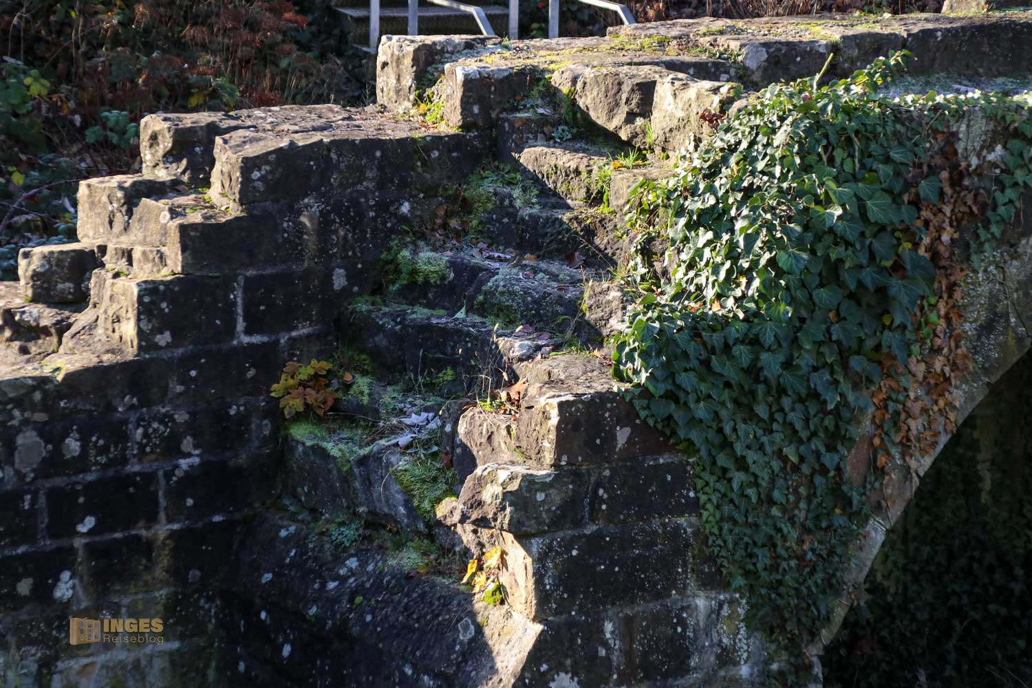 Zwischendrin ein kleines Wegle, das in die Innenstadt führt. Denn wir sind hier außerhalb der ehemaligen Stadtmauer unterwegs. Am Ende des Weges Reste des Stadtmauerturms, der Mitte des 14. Jahrhunderts erbaut wurde. Die Stadtmauer wurde in Schorndorf in zwei Abschnitten erbaut. Der erste Teil so um 1299 umschloss ja nur den Bereich zwischen Marktplatz und Burgschloss. Die damalige Kirche westlich von diesem Bereich blieb außerhalb der Stadtmauer und wurde erst im 14. Jahrhundert mit einbezogen. Ein großer Graben hat die beiden Bereiche, die so wie in Strümpfelbach einfach mit Ober- und Unterstadt bezeichnet wurden, getrennt. Wieee groß der war, seht ihr später auf dem Marktplatz.