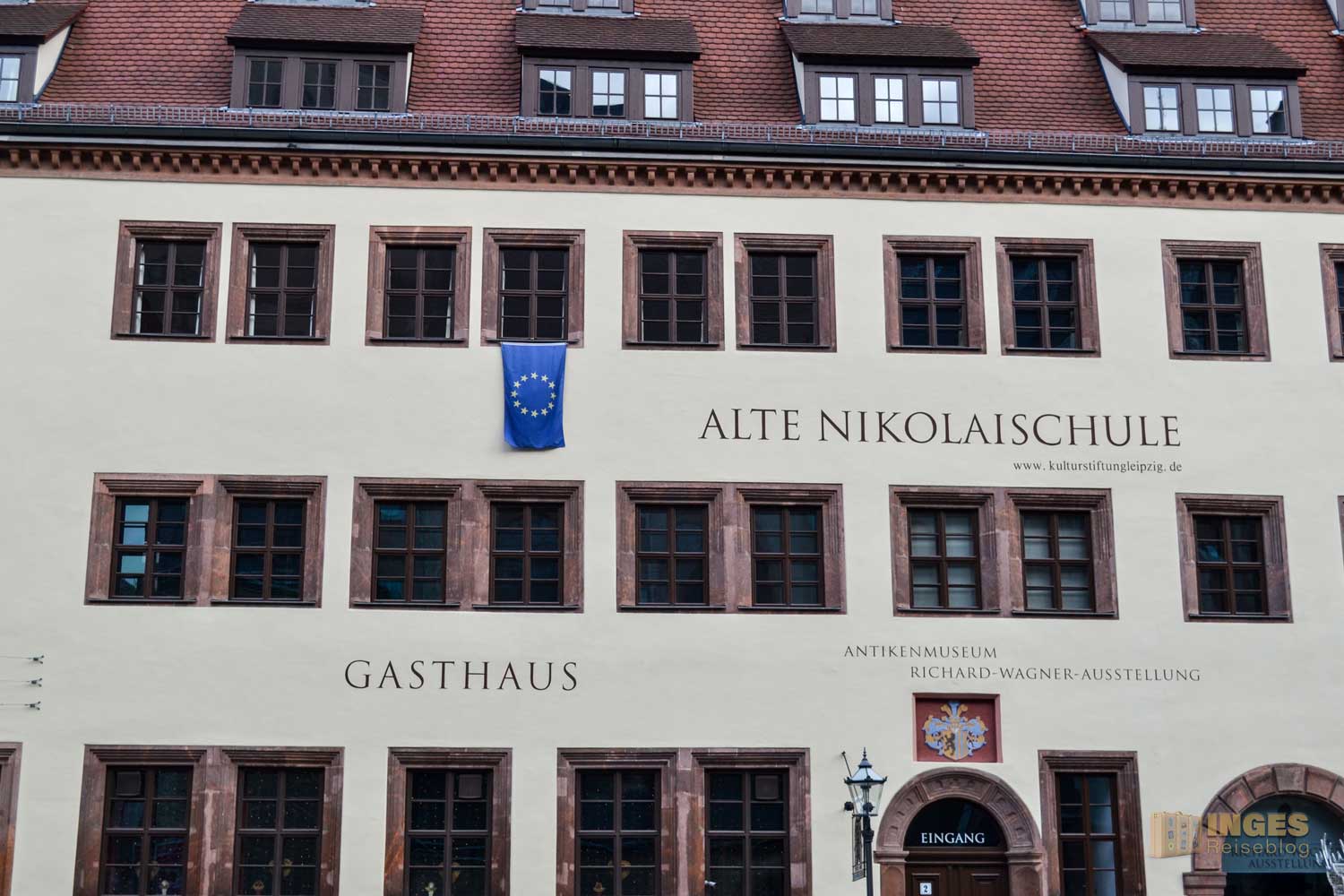 Am Ende der Nikolaistraße steht auf dem Platz vor der Nikolaikirche, dem Nikolaikirchhof die 1511 gegründete Alte Nikolaischule. Die erste städtische Schule in ganz Deutschland. Berühmtheiten haben hier die Schulbank gedrückt, wie Christian Thomasius, Gottfried Wilhelm Leibniz, Richard Wagner oder Karl Liebknecht. Nachdem 1870 die Schule zu klein geworden ist, zog sie 1872 in einen größeren Neubau außerhalb der Stadt um. Sehr imposant sind auch die Gebäude neben der Schule. Ein im spätgotischen und Renaissancestil erbautes Predigerhaus mit seinen Türmchen under Erkern. Es ist das Pfarrhaus der Nikolaikirche. Am Ende des Platzes steht die Nikolaisäule, die einer der Säulen in der Kirche nachgebildet ist. Sie erinnert an die "Friedliche Revolution" von 1989, die hier begann. Sie war der Beginn die am 3.10.1990 zum Ende der DDR geführt hat.