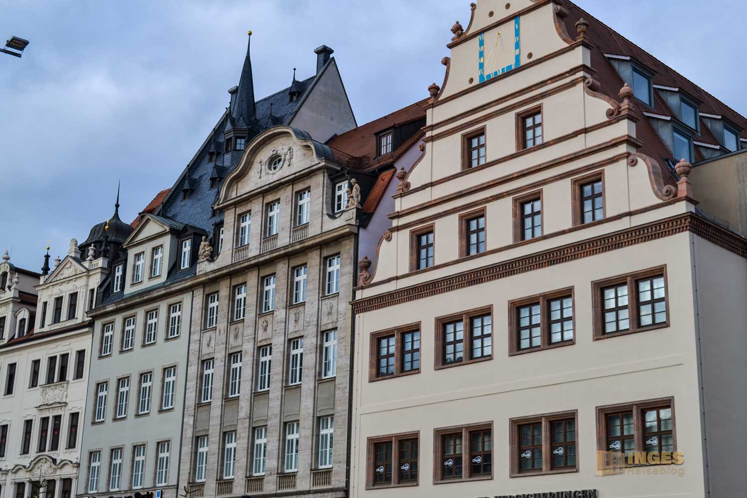 Bevor der Stadtrundgang durch die Katharinenstraße weitergeht, kommt man an der imposanten Nordseite des Marktes mit dem auffälligen Gebäude der Alten Waage nicht vorbei. 1555 wurde dieses Gebäude im Zuge der Handelstätigkeiten der Stadt erbaut. Es löste einen Vorgängerbau ab, in dem Handelsgüter, die nach Leipzig gebracht wurden zum Zweck der Besteuerung gewogen wurden. Schließlich musste die Stadt ja auch ihre Einnahmequellen haben. Das Renaissance-Gebäude wurde 1943 bei dem schweren Bombenangriff vollständig zerstört. Der Nachbau ist dem Original nachempfunden.