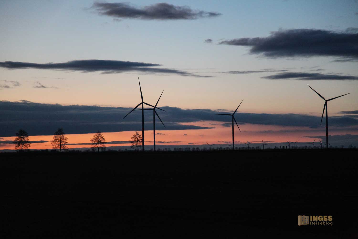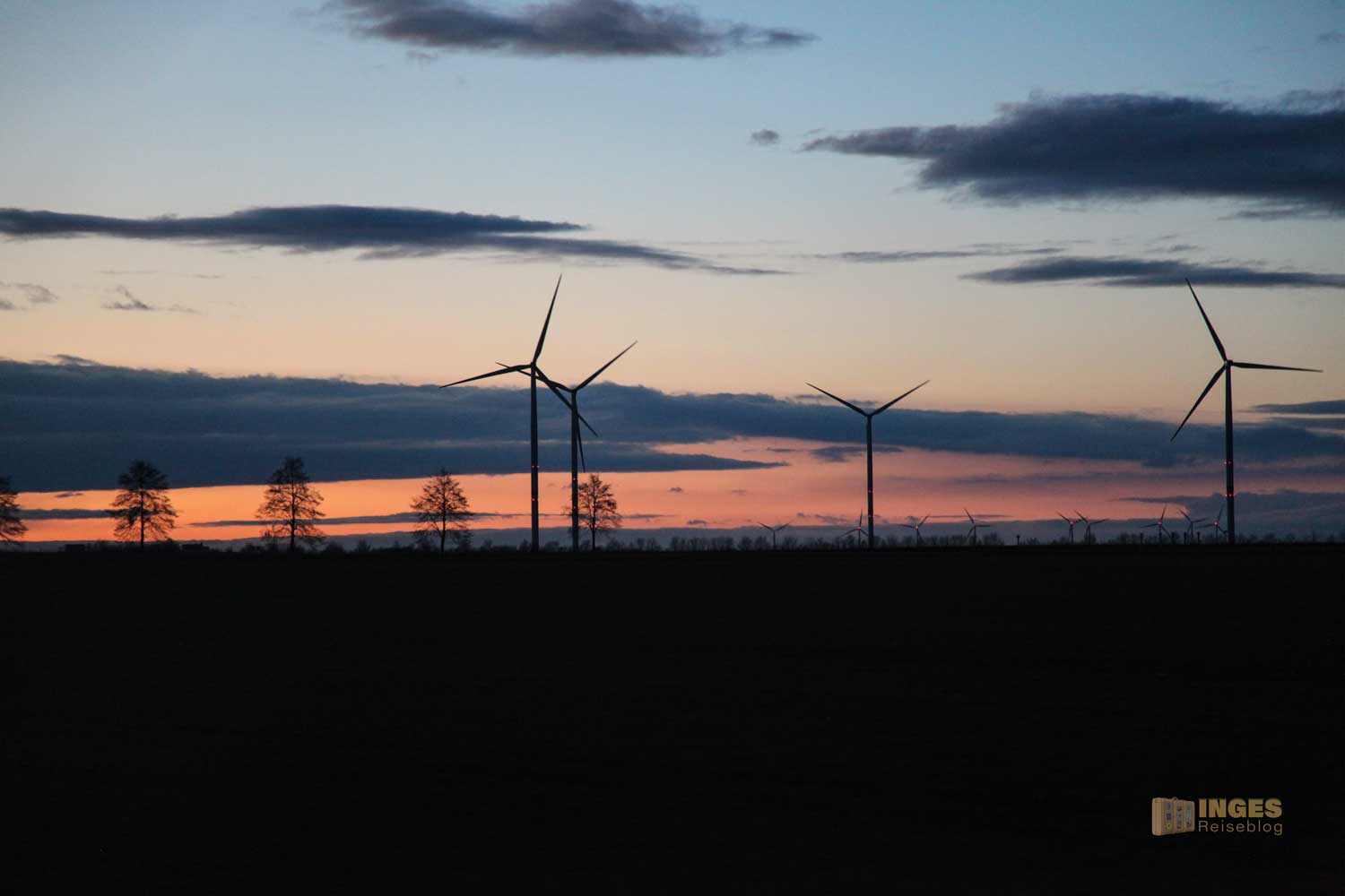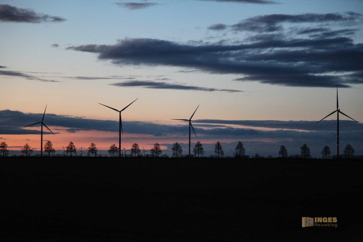 Müde ging es wieder über Bundes- und Landstraßen zurück nach Naumburg. Es war eine tolle Fahrt, trotz aller Müdigkeit - die untergehende Sonne (ja, wir hatten am 23.12. wirklich perfektes Wetter), die Kulisse mit den unzählig vielen drehenden Windrädern mit ihren blinkenden Lichtern ... Während ich Fridolin 'nach Hause' führte, hat mein Mann versucht diese Stimmung einzufangen.
