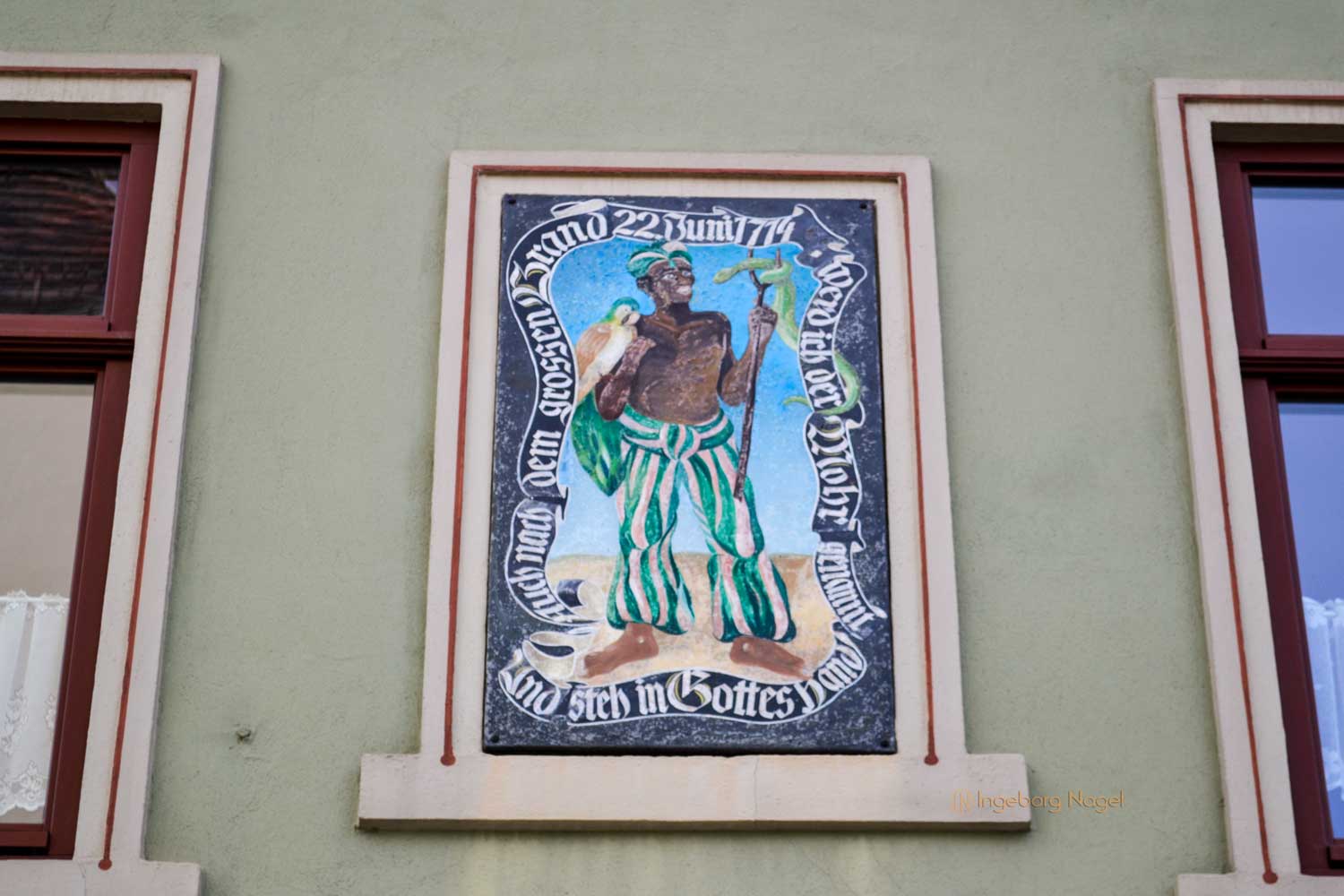 Wir haben unseren Rundgang am Dom begonnen. Zum Dom, seit 2018 Weltkulturerbe, könnt ihr in einem anderen Beitrag lesen. Durch den Steinweg geht es vom Domplatz zur Bürgerstadt. Sie gehört zu den ältesten gepflasterten Straßen Naumburgs. Die Häuser hier wirken im Vergleich zu anderen Straßenzügen eher schlicht. Fast alle sind nach dem großen Stadtbrand von 1714, der durch einen unvorsichtigen Händler mit einer großen Pulverexplosion ausgelöst wurde, entstanden. Man muss durch Naumburg tatsächlich als 'Hans guck in die Luft' laufen. Ansonsten würde man in dieser Straße die Tafel mit dem Mohren übersehen, der auf dieses Ereignis hinweist "Auch nach dem großen Brand - 22. Juni 1714 - werd ich der Mohr genannt - und steh in Gottes Hand."