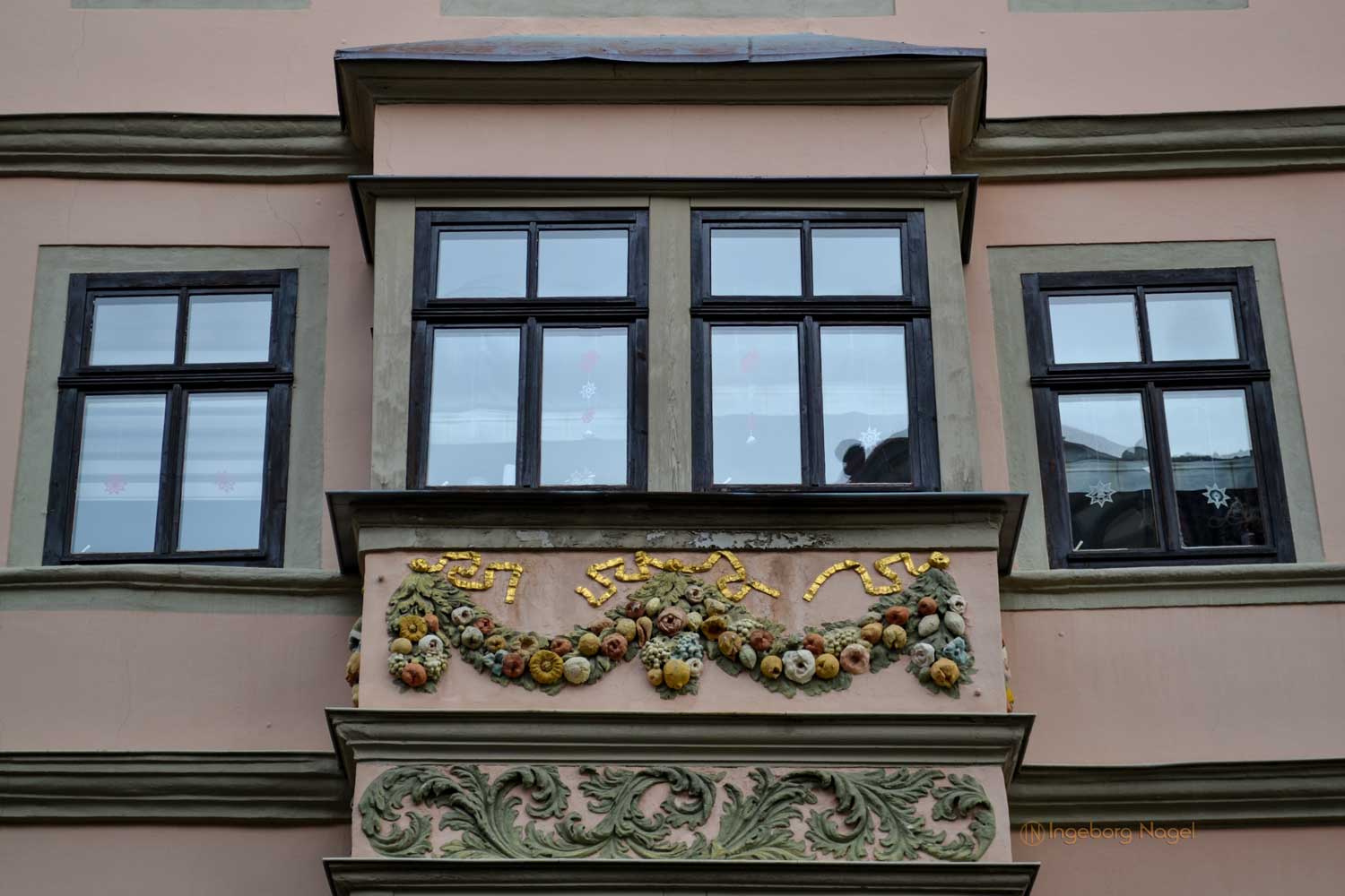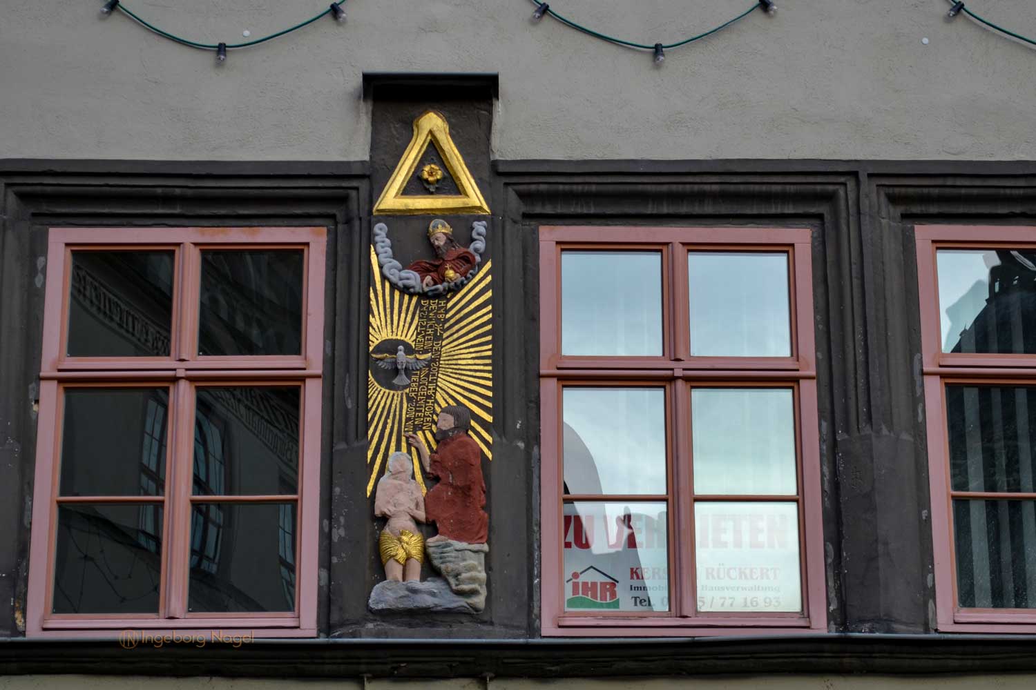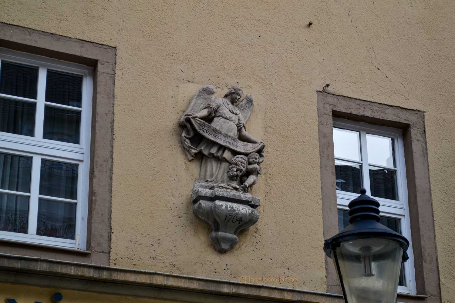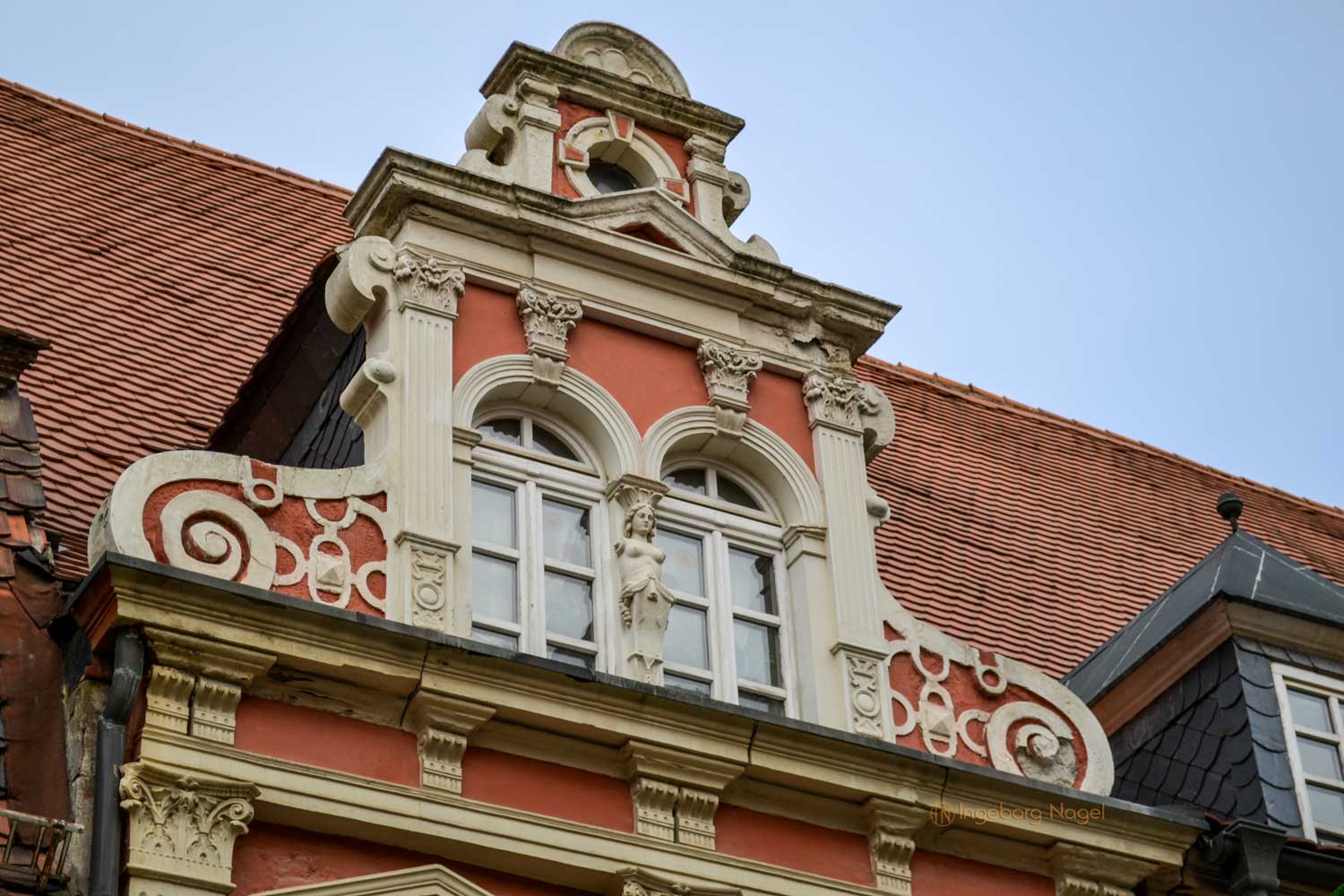 Weiter geht es durch die Herrenstraße, die bereits 1314 erwähnt ist und damit auch zu den ältesten Straßen Naumburgs gehört. Benannt wurde sie nach den DomHERREN, deren Weg auf dieser Straße in die Stadt führte. Diese repräsentativen Häuser wurden nach dem großen Stadtbrand 1517 errichtet. Und spätestens jetzt bei den Fotos wisst ihr, was ich mit dem 'Hans guck in die Luft' gemeint habe. Die interessantesten Kleinigkeiten spielen sich oben ab ....