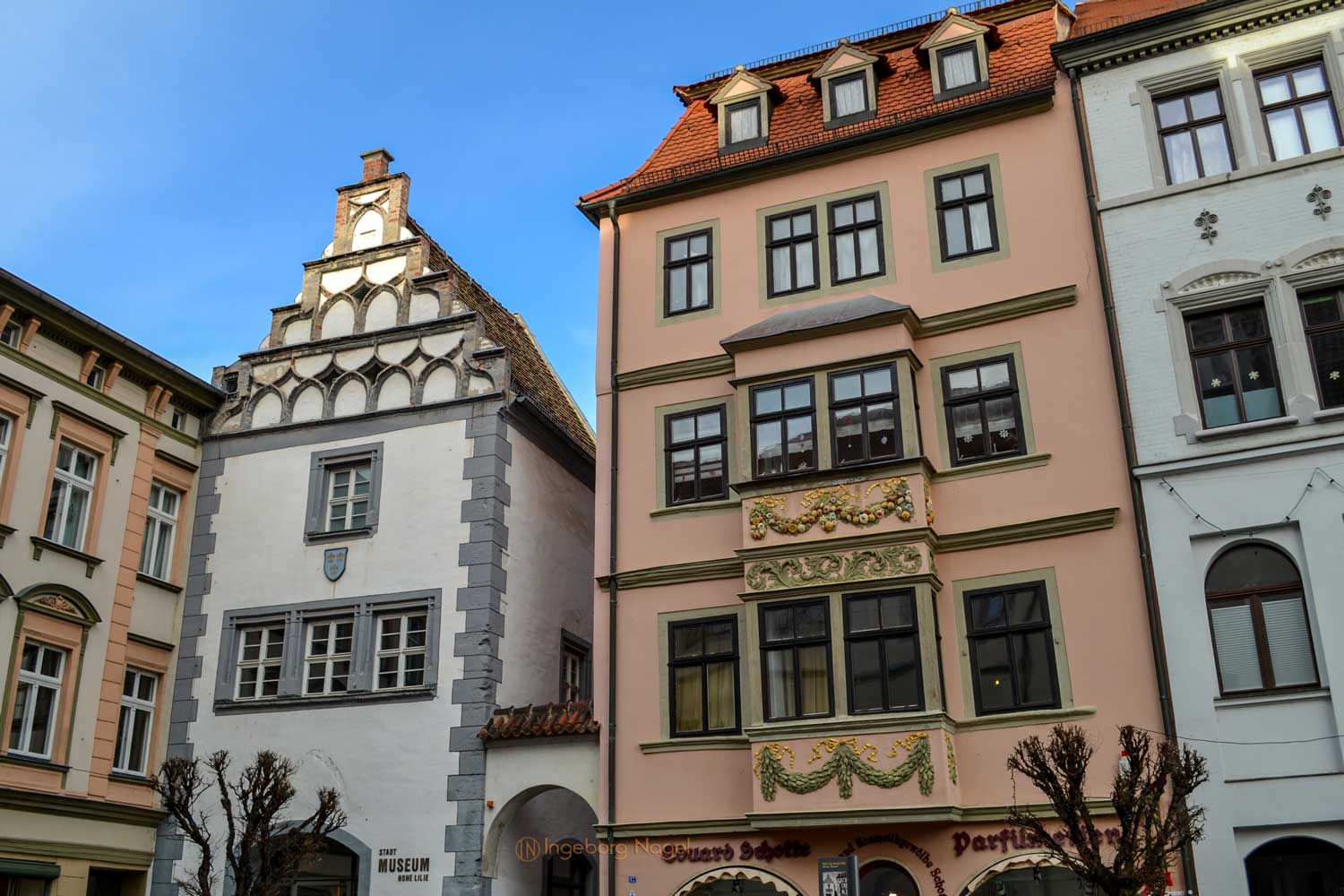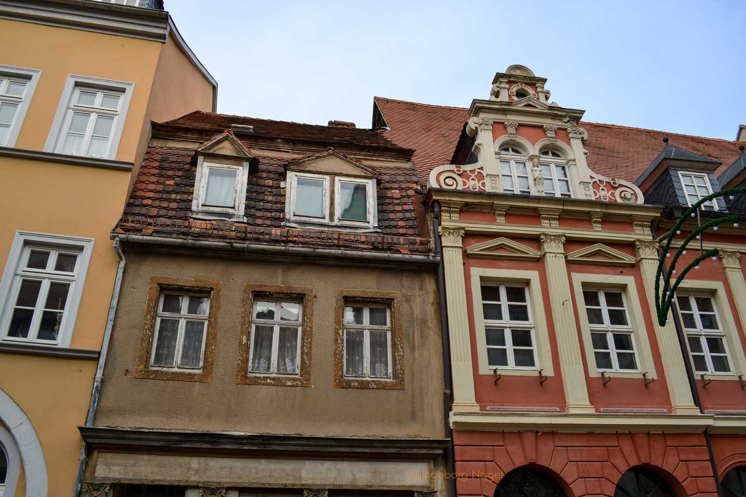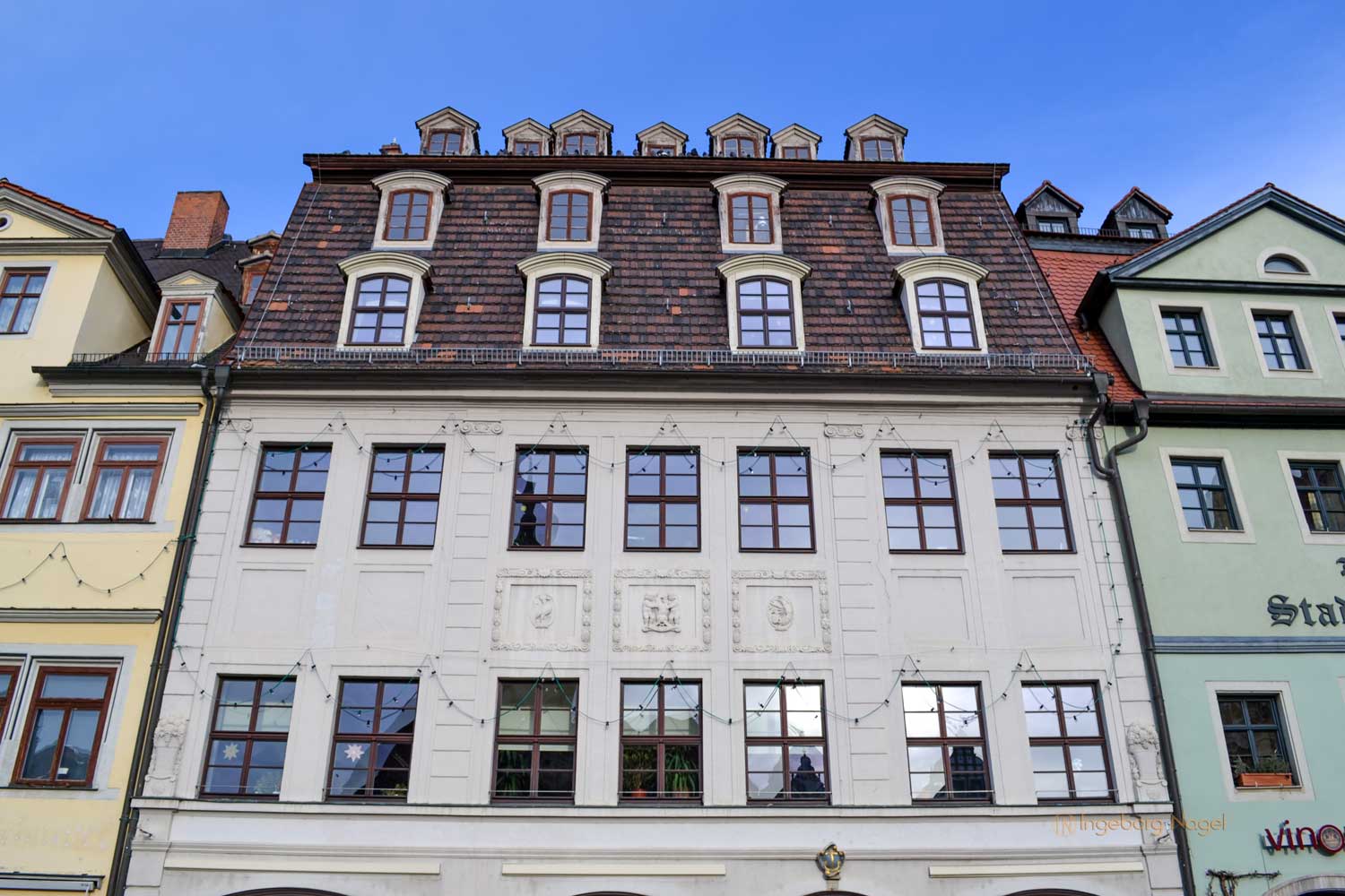 Damit aber immer noch nicht genug. Da der Markt rechteckig von Häusern gesäumt ist, geht es jetzt zur vierten Seite, und damit zur Residenz und zum Marktbrunnen. Naumburg war nur kurzzeitig Residenzstadt. Diese Zeit hat aber ausgereicht, damit Kurfürst Johannes Georg 1652 für seinen Sohn Herzog Moritz von Sachsen-Zeitz mit einem Umbau eine Residenz errichten ließ. Die Schlichtheit, im Vergleich zu anderen Gebäuden am Markt, verwundert. Das Gebäude war jedoch nicht zur Repräsentation gedacht. Aber auch in diesem Gebäude waren illustre Gäste beherbergt, wie der preußische König Friedrich Wilhelm III. oder Napoleon.