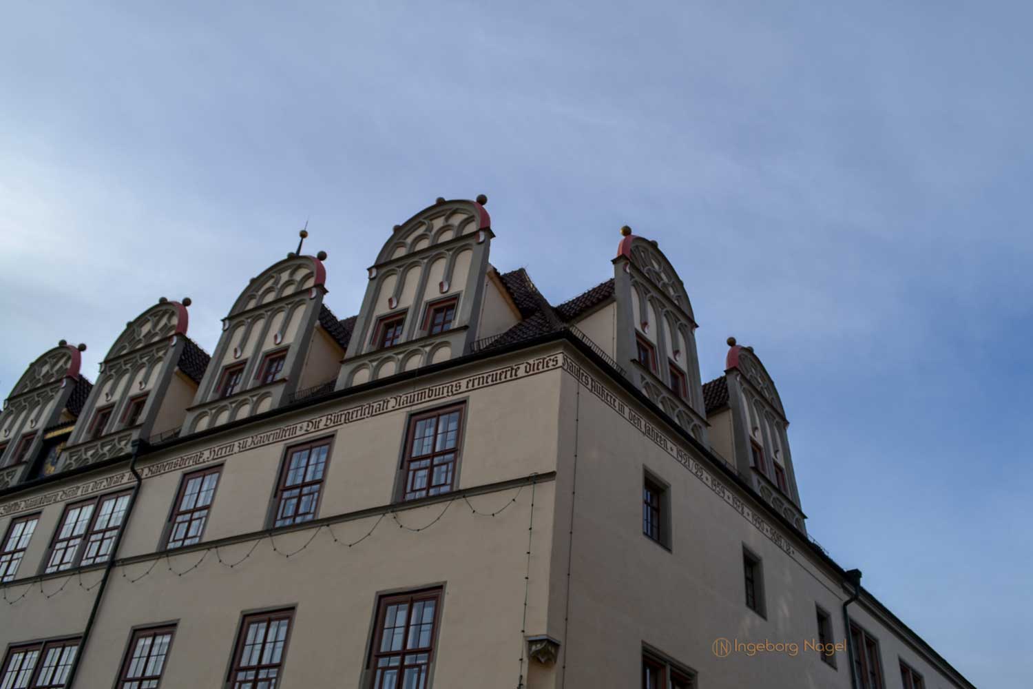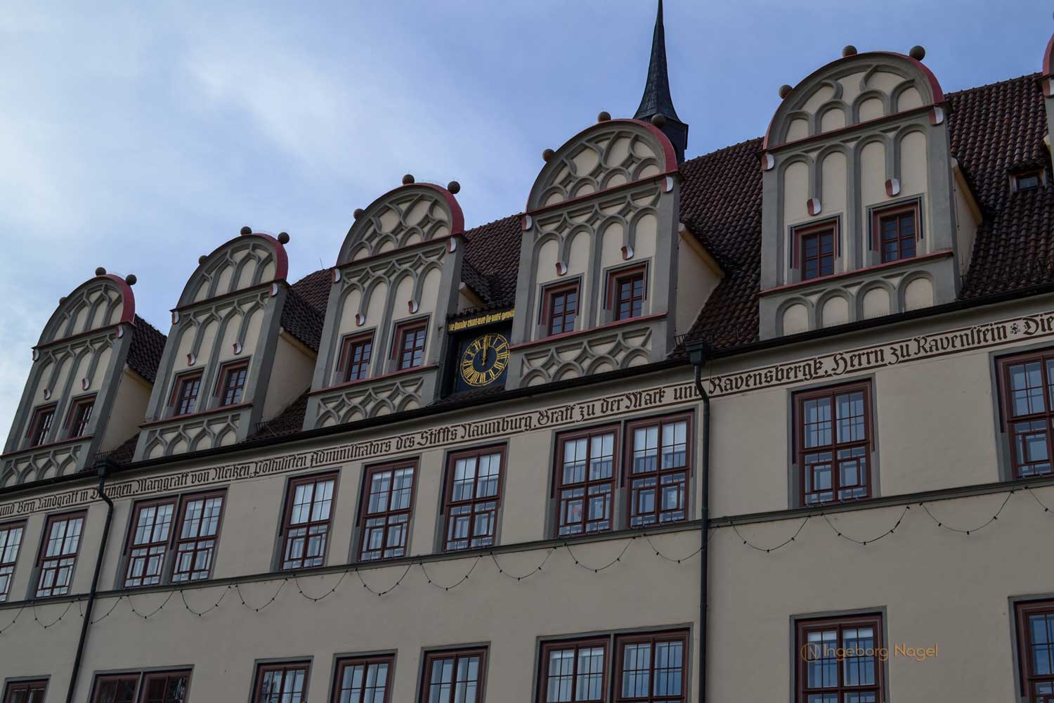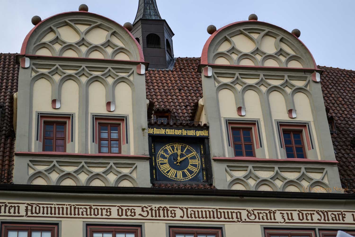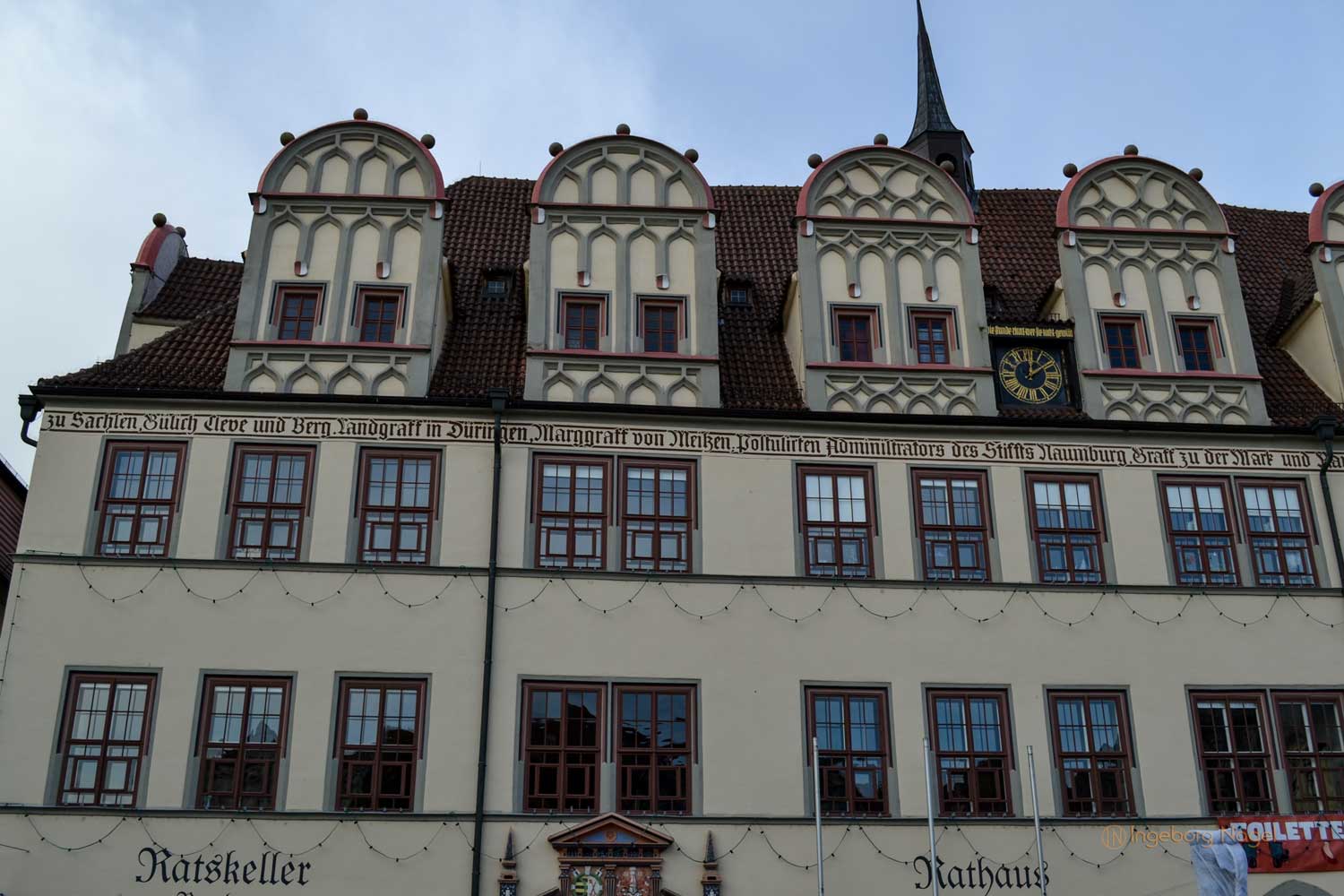 Prachtvoll steht das Rathaus am Markt. Der heutige Bau entstand nach dem großen Stadtbrand 1517. Beim Aufbau wurden aber Teile des Vorgängerbaus mit einbezogen. Bereits 1384 stand an dieser Stelle das erste Rathaus von Naumburg. Das Dach zieren sechs gleich gestaltete Rundbogenerker. Wunderschön ist das Rathausportal ...