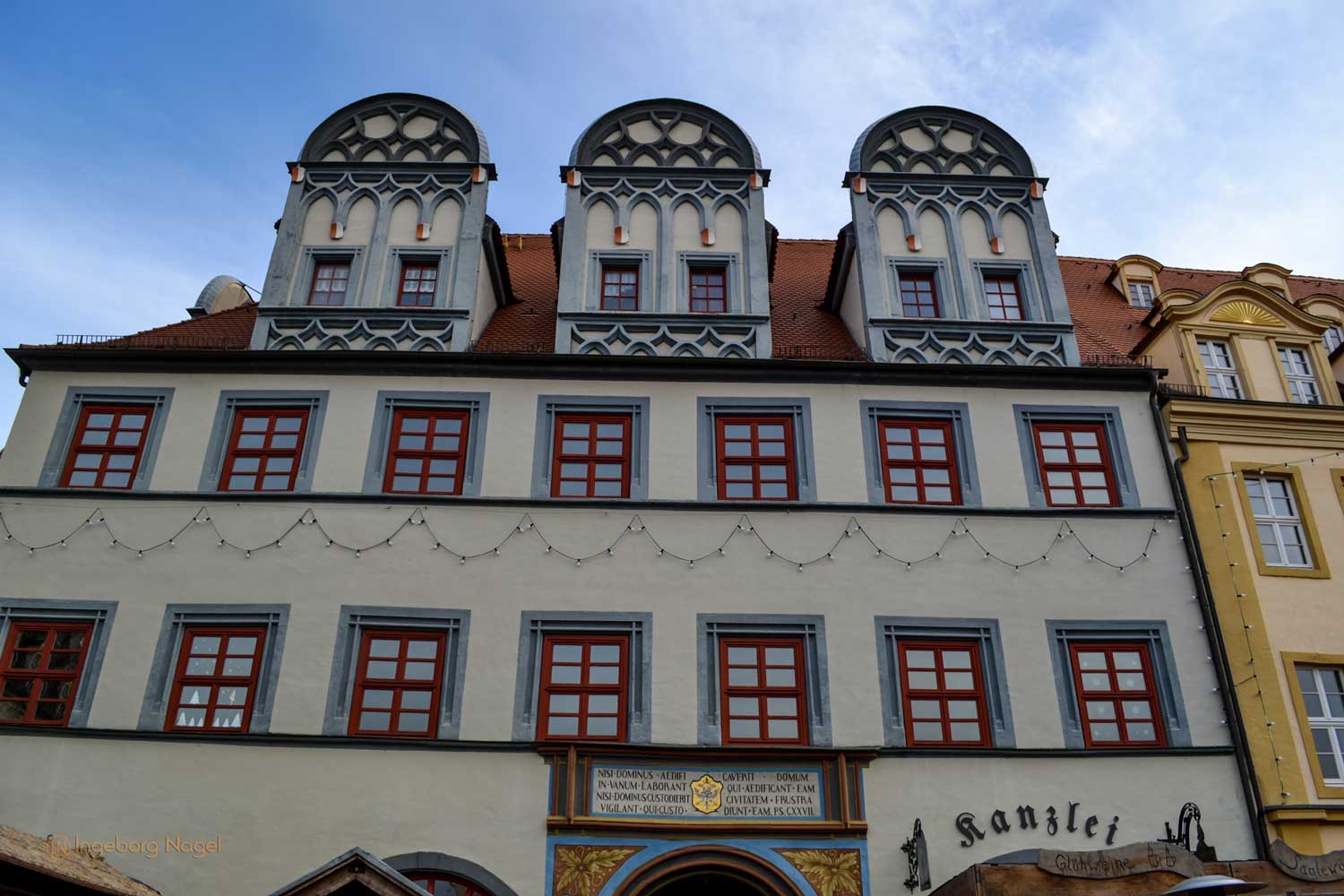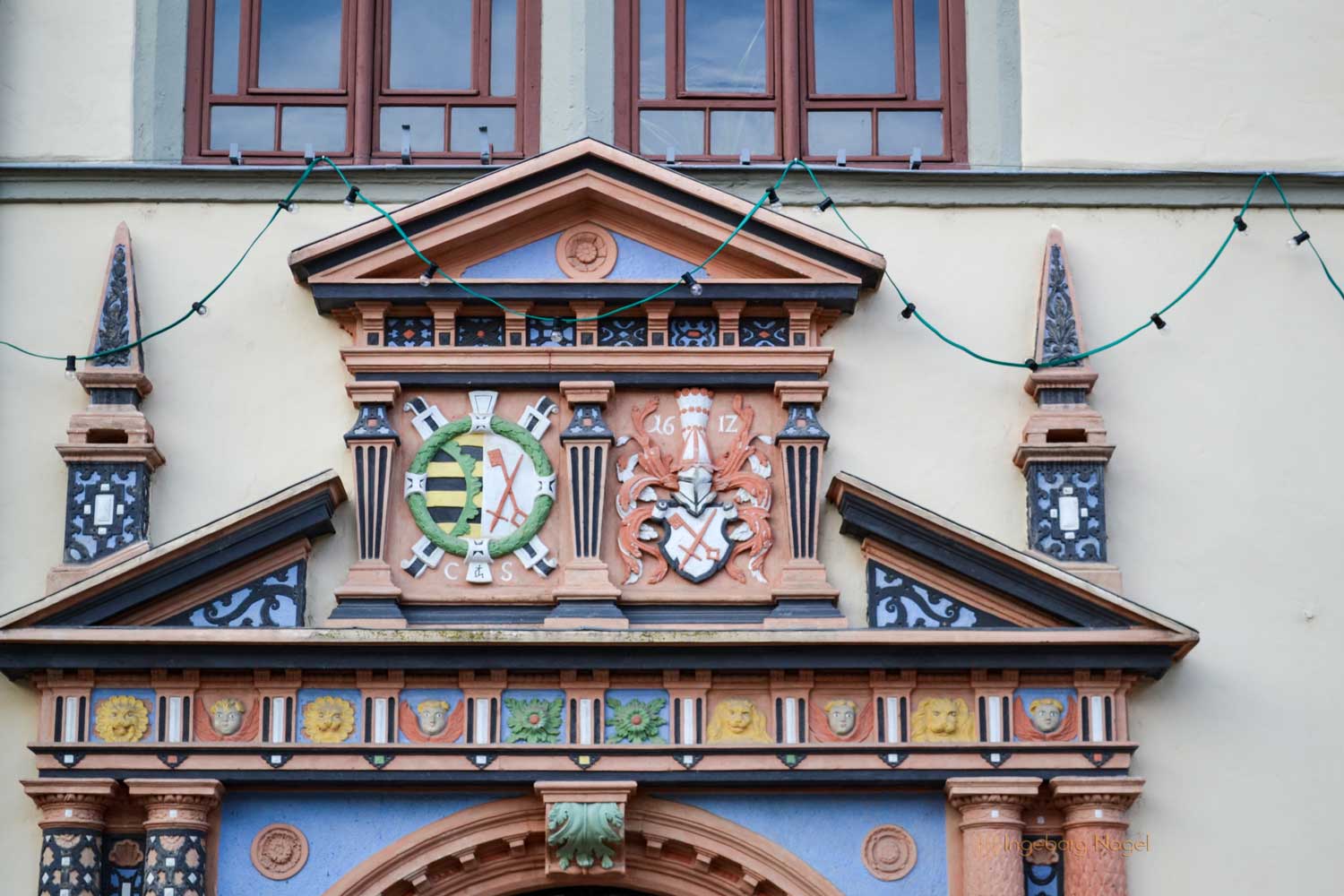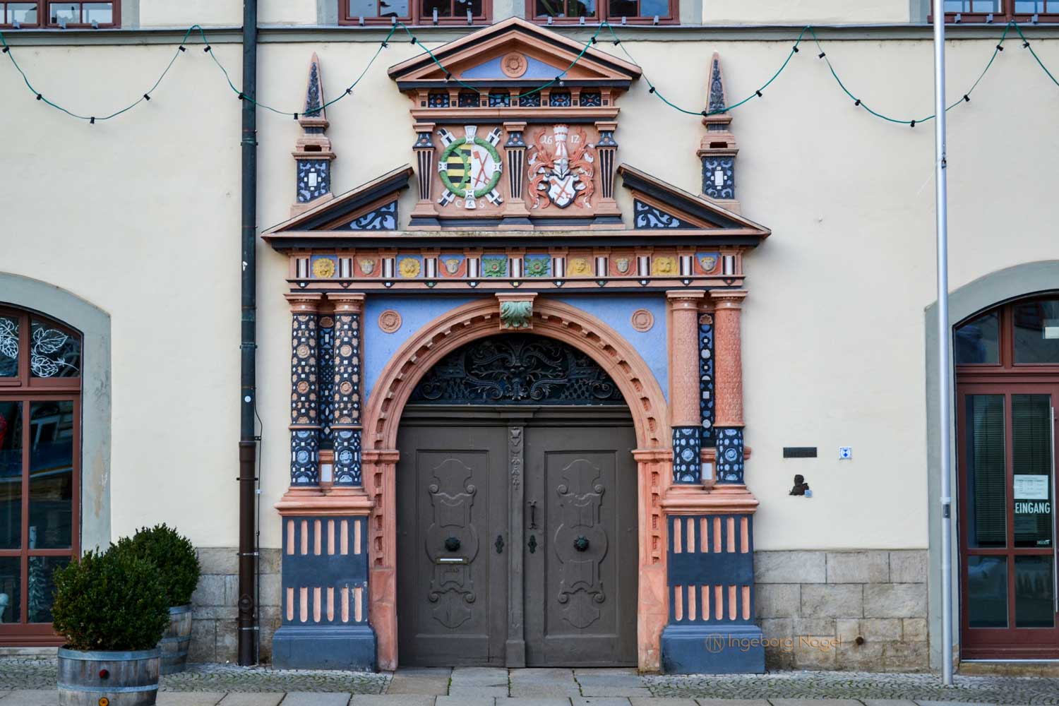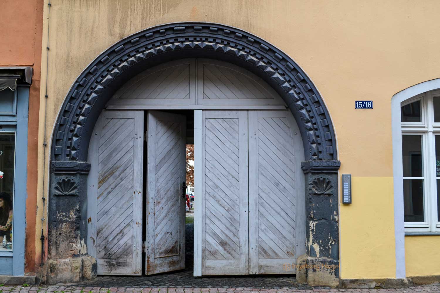 Damit sind wir aber am Markt noch lange nicht fertig. Gegenüber dem Rathaus steht ein weiteres Schmuckstückchen, das Kaysersche Haus. Besonders das prächtige Eichentor von ca. 1680 zieht die Blicke an. Der Reichsadler über dem Portal erinnert daran, dass Kaiser Karl V. 1547 in diesem Haus in Naumburg war.