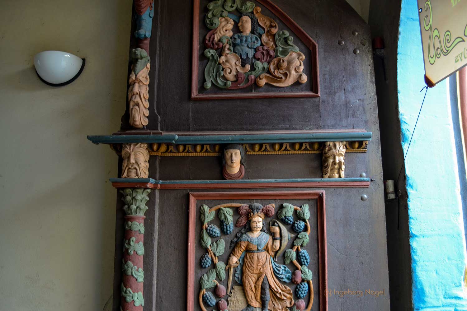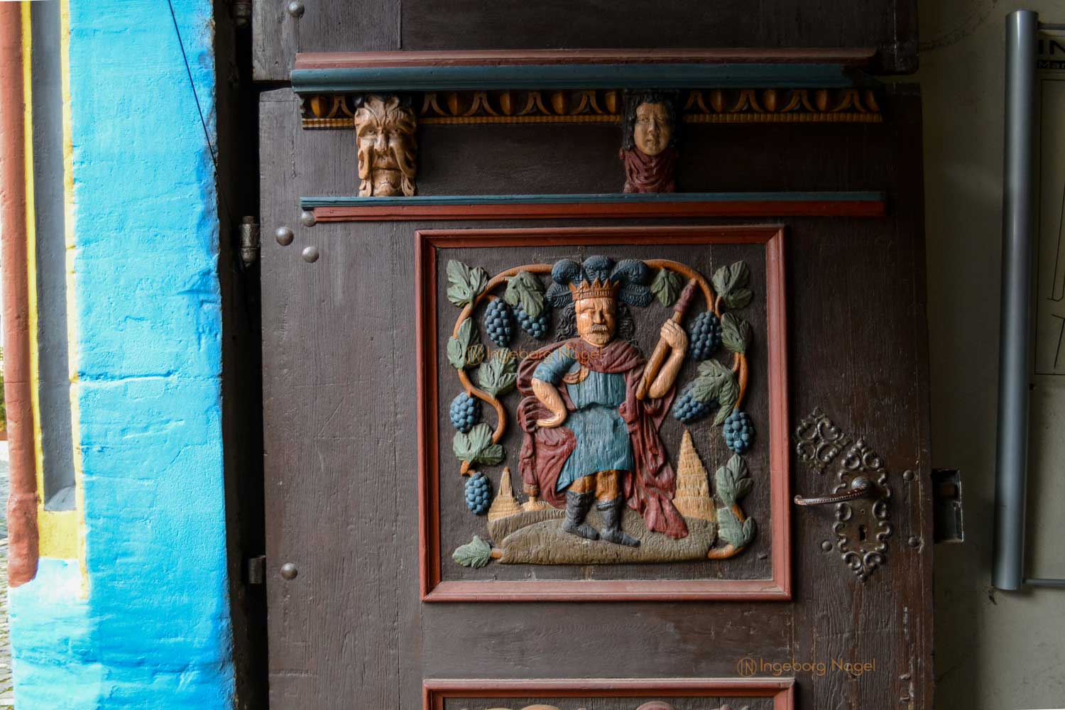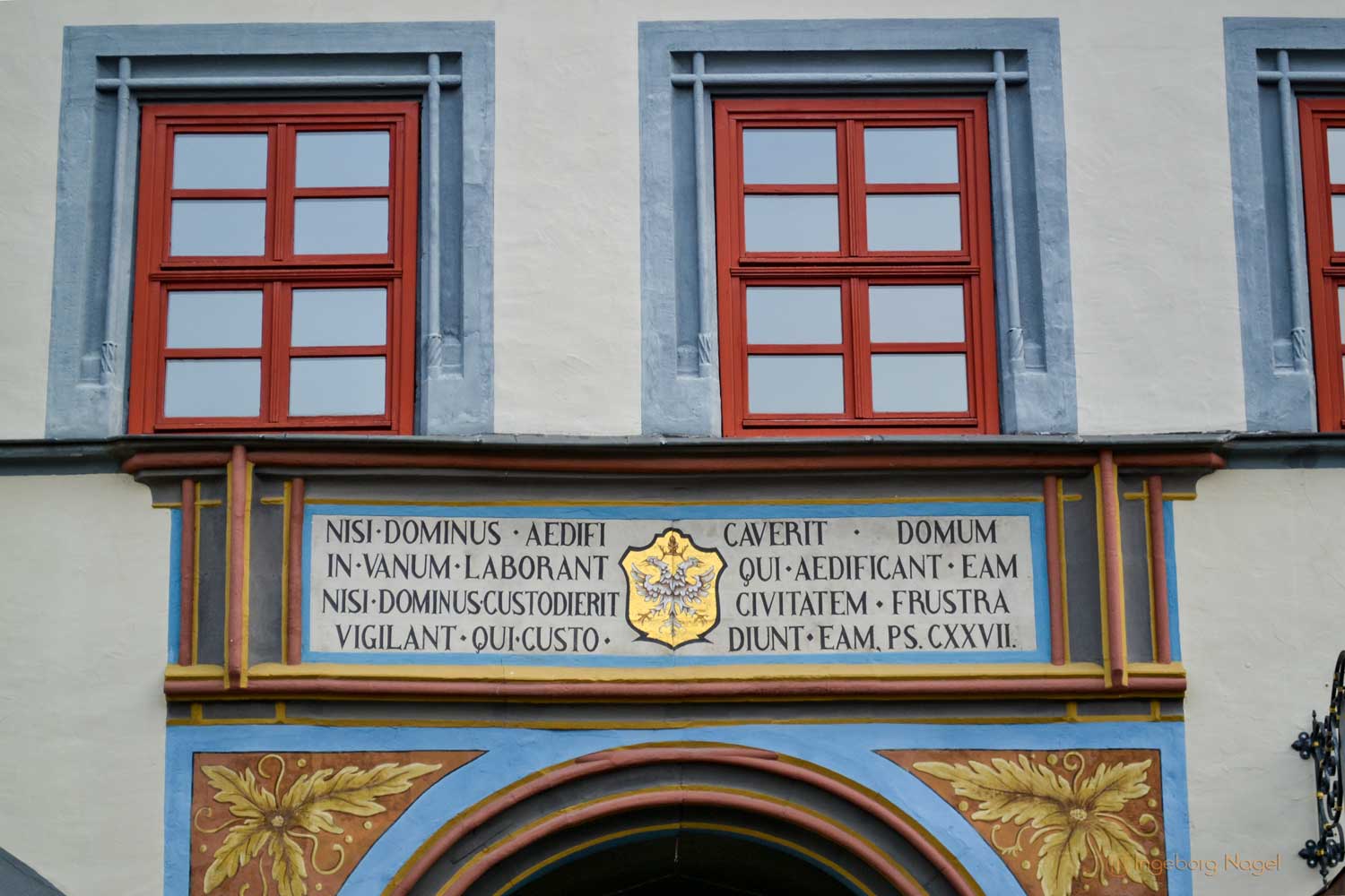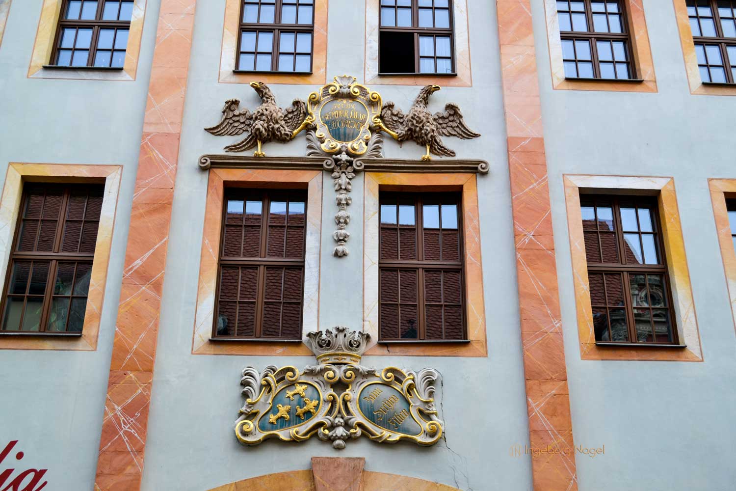Damit sind wir aber am Markt noch lange nicht fertig. Gegenüber dem Rathaus steht ein weiteres Schmuckstückchen, das Kaysersche Haus. Besonders das prächtige Eichentor von ca. 1680 zieht die Blicke an. Der Reichsadler über dem Portal erinnert daran, dass Kaiser Karl V. 1547 in diesem Haus in Naumburg war.