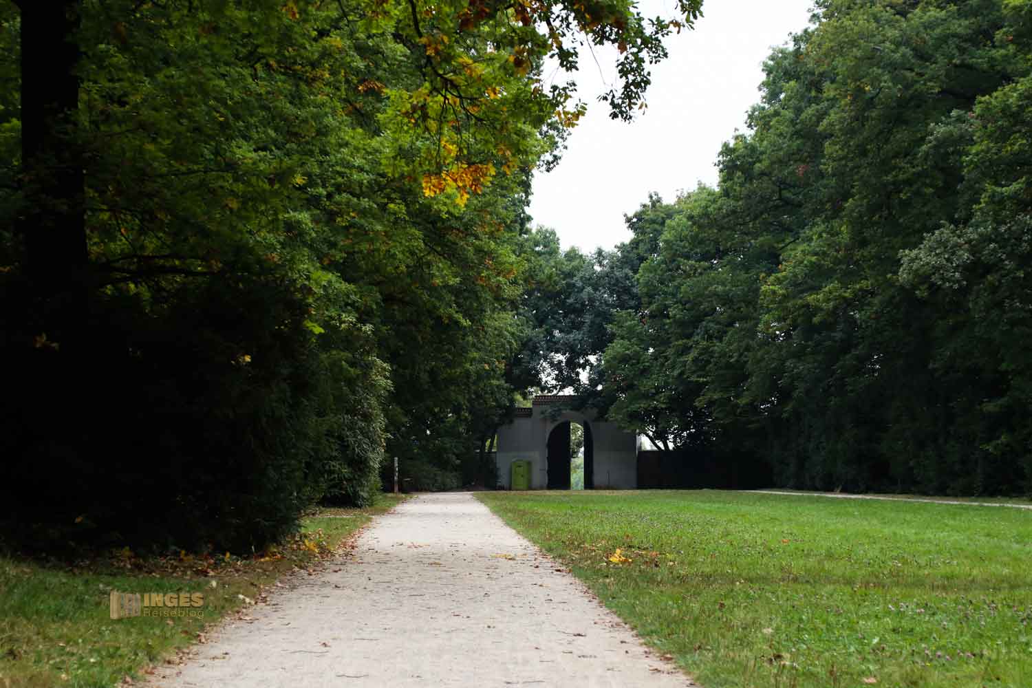 In den Park von Schloss Stern führen vier Tore, dieses, auf das wir gerade zulaufen, ist das Haupttor direkt gegen über dem Schloss.