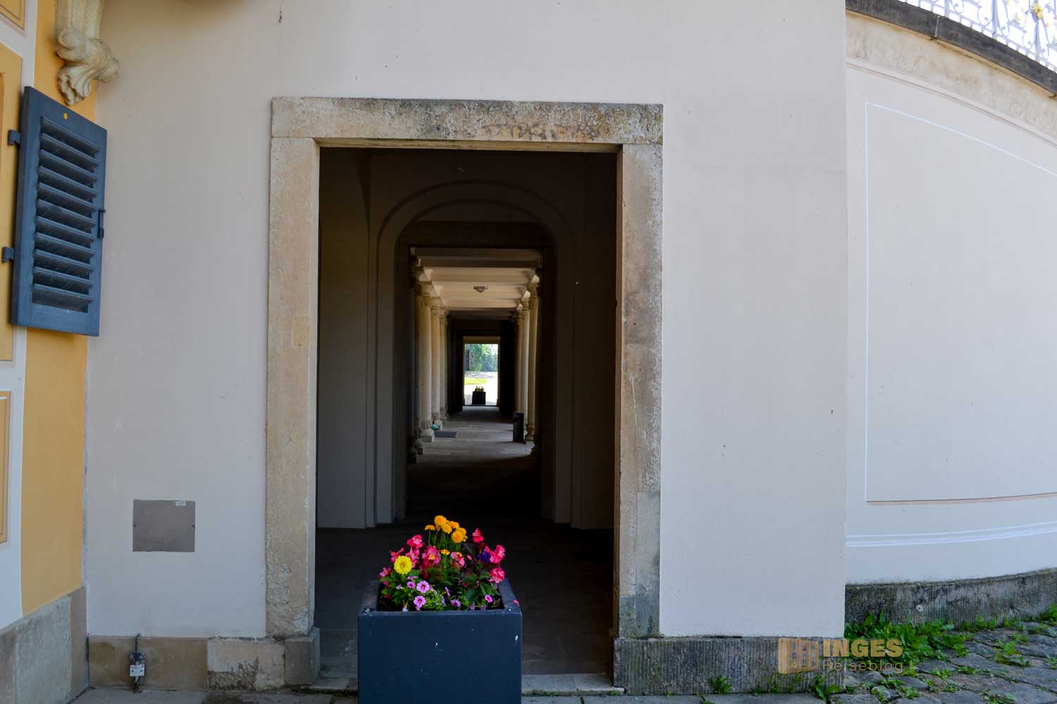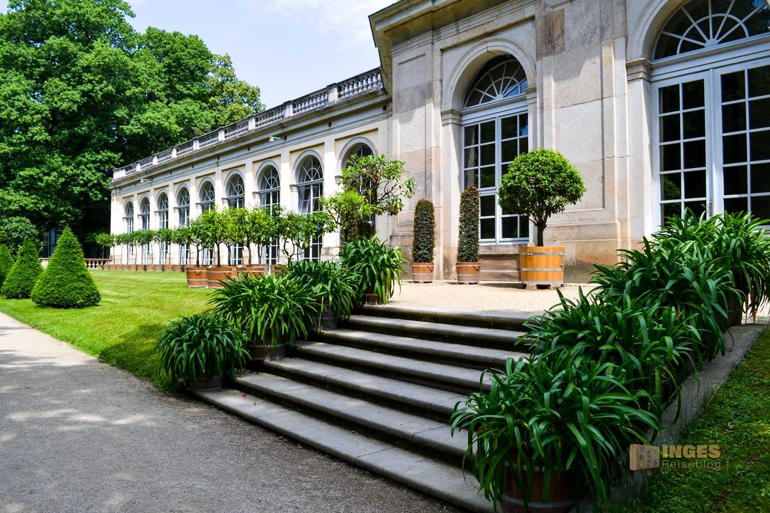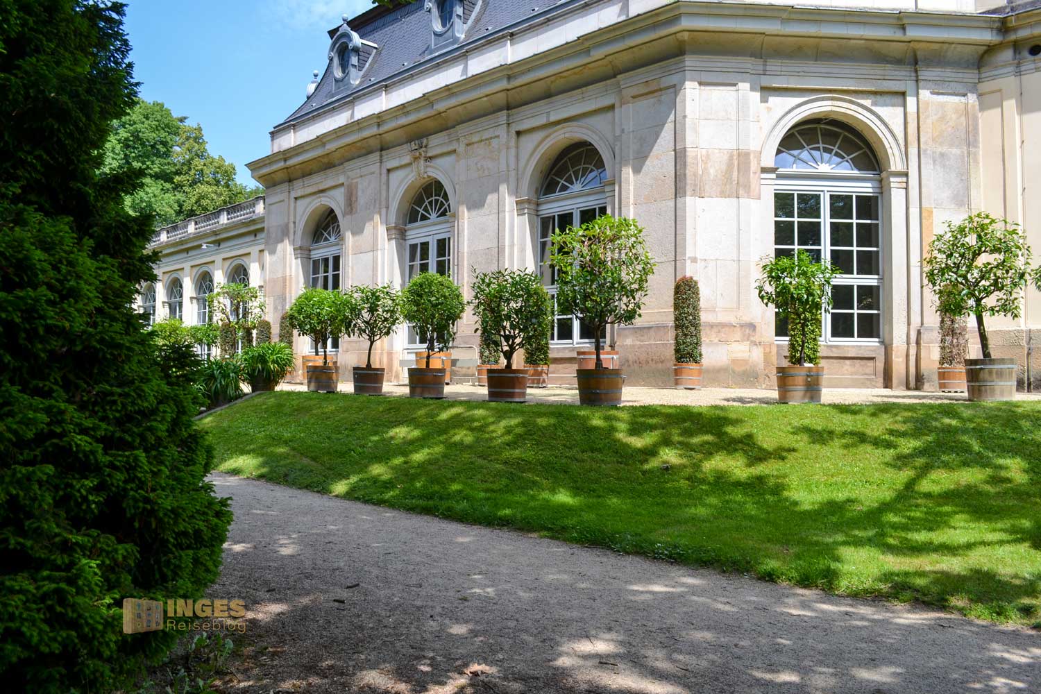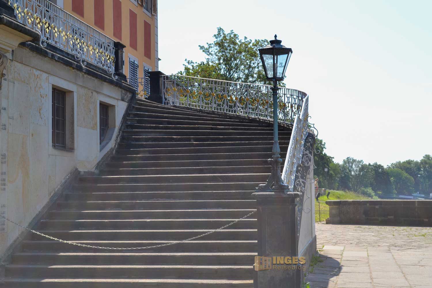 der für uns durch den Gang der langen Baumallee beginnt. Dieser gesamte Teil ist kostenfrei, und auf dem Rückweg zum Parkplatz haben einige dort ihr Plätzchen für ein Picknick gewählt. Auch der Weg direkt an der Elbe, vorbei am Wasserpalais ist im kostenfreien Bereich. Aber ganz ehrlich, nur ein Spaziergang dort an der Elbe entlang und nicht in den Schlossbereich, wäre jammerschade. Und der Eintrittspreis von 8,00 € ist wirklich sehr moderat. Montags ist aber geschlossen.