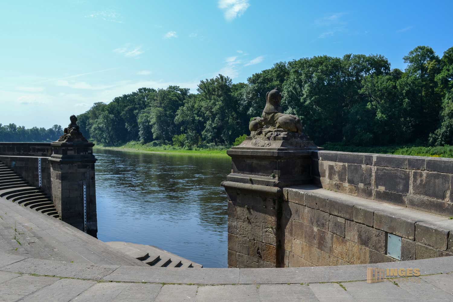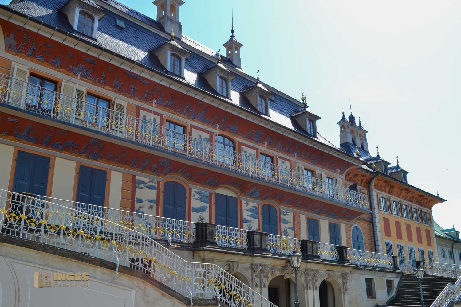 erbaut. August der Starke wollte das Gebäude im Stil der damals herrschenden Chinamode errichten. Und so entstand unter Verwendung ostasiatischer und orientalischer Elemente dieses Wasserpalais. Die geschwungene Schlosstreppe wurde 1724 als großartige Schiffstreppe bis hinunter zur Elbe verlängert. So konnte man mit den Gondeln, mit denen man von der Residenz in Dresden nach Pillnitz schipperte, direkt am Palais anlanden.