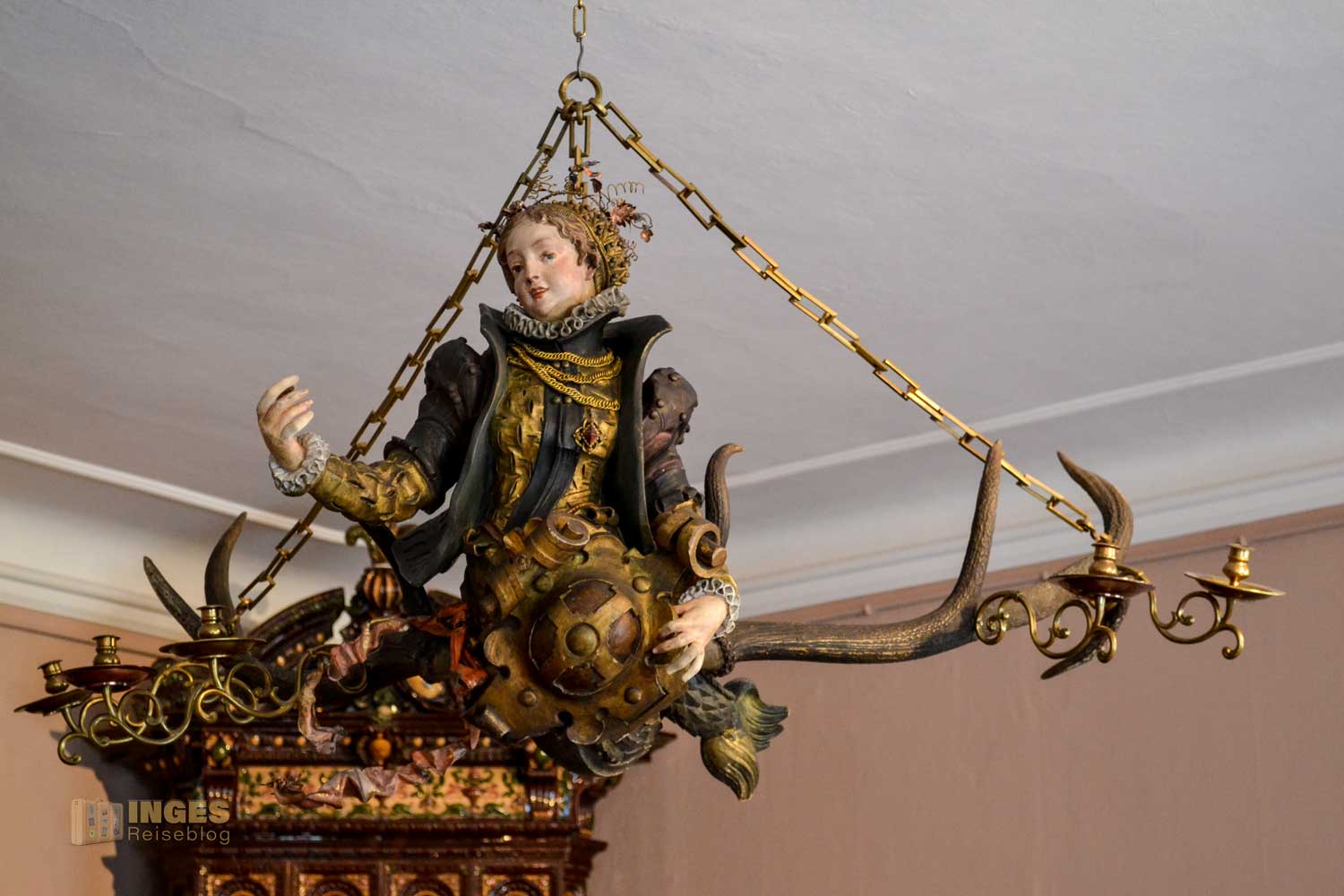 In der übrigen Ausstellung gibt es neben einem herrlichen Fliesenbild, welches 1900 auf der Weltausstellung in Paris ausgestellt war und 1903 dem Museum von Villeroy & Boch geschenkt wurde, auch noch ein Lüsterweibchen zu sehen. Zum ersten Mal ist mir diese Art von Kronleuchter auf der Reichsburg Cochem aufgefallen, in der Folge dann in ganz vielen anderen Burgen und Schlössern.