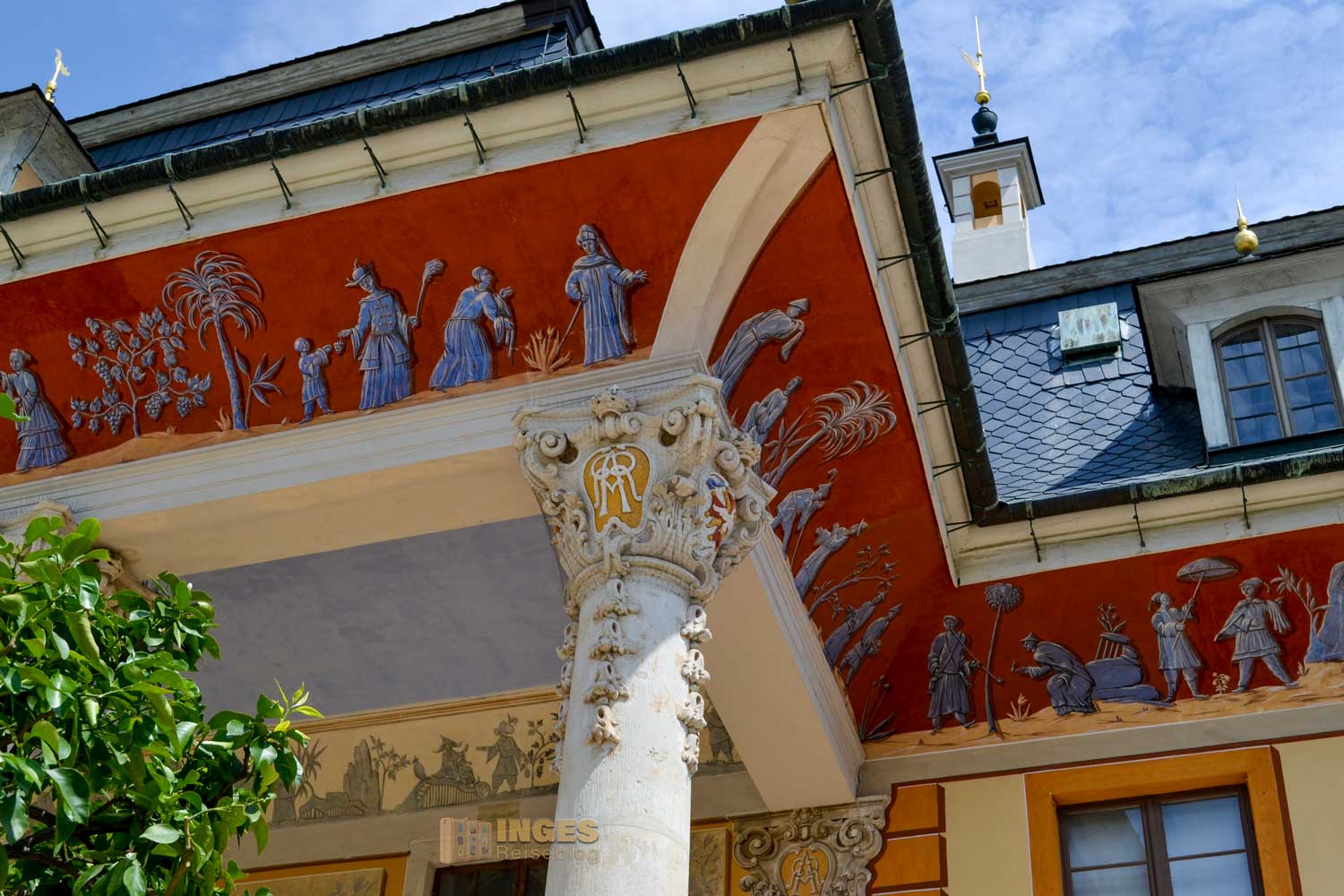 geht wieder auf August den Starken zurück. Zwar wurde im 14. Jahrhundert Pillnitz schon als Herrensitz erstmals erwähnt, aber so richtig 'Leben' erhielt der Ort erst durch Kurfürst Friedrich August, einfach August der Starke. Eigentlich gehörte ja seinem Bruder Kurfürst Johann Georg IV. das Pillnitzer Anwesen, das er durch einen Tausch erhalten hatte. Aber wie ihr vielleicht in meinem Bericht von Schloss Moritzburg schon gelesen habt - nach dem überraschenden und frühen Tod von Johann Georg IV. auf dem Schlachtfeld ging das Anwesen 1706 durch einen Rückkauf an seinen Bruder August. Er schenkte dann das Schloss seiner Mätresse, Gräfin von Cosel. Nachdem die Gräfin bei ihm aber 1718 in Ungnade gefallen war, holte er sich seinen Besitz durch Enteignung wieder zurück. Tja ... Pustekuchen, so schnell geht das. Nur zwei Jahre hatte sie das Schloss als ständigen Wohnsitz. Fortan soll Schloss Pillnitz nun als Repräsentationsbau der höfischen Gesellschaft dienen.