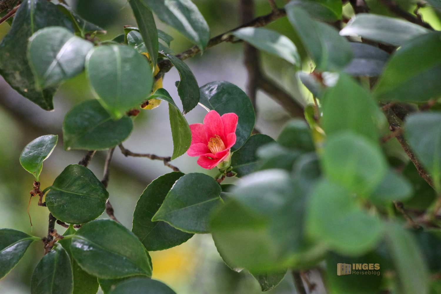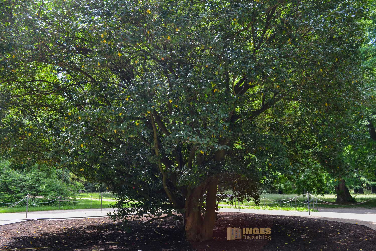 Die über 8,90 Meter hohe und über 230 Jahre alte Kamelie gilt als botanische Sehenswürdigkeit. Bereits 1801 wurde sie an dem heutigen Platz gepflanzt und zählt damit zu einer der ältesten japanischen Kamelien in Europa. Die Blütezeit war zwar bereits vorbei, aber doch aber wir noch eine gesichtet.