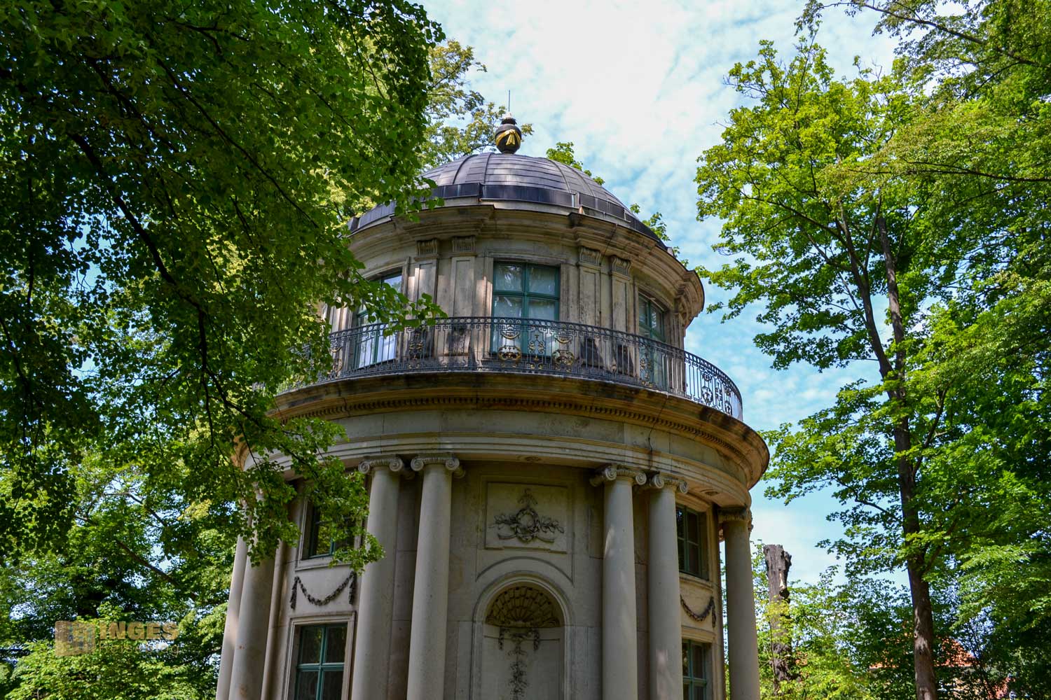 1778 hat Friedrich August der Gerechte (im Dresdner Fürstenzug reitet er auch mit) diesen Teil des Landes aufgekauft, mit dem Gedanke, dort einen Garten nach englischem Vorbild anzulegen. 1780 wurde der Pavillion als Rundtempel erbaut. Nach dem Vorbild des Tempietto, einem Rundtempel im Hof eines ehemaligen Klosters in Rom.