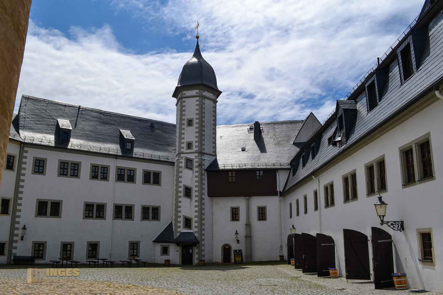 Herzog Moritz von Sachsen, der Bruder von August (der von Schloss Augustusburg), baute von 1545-1547 die Burg in ein Jagschloss im Renaissancestil um. Auch der "Dicke Heinrich" erhielt ein Renaissancehäubchen. Teile dieser Umbauten sind heute mit dem Süd- und Westflügel noch erhalten. Ihr seht dies später noch, dass diese Teile wirklich noch damals erhalten sind.