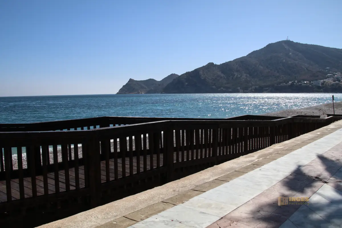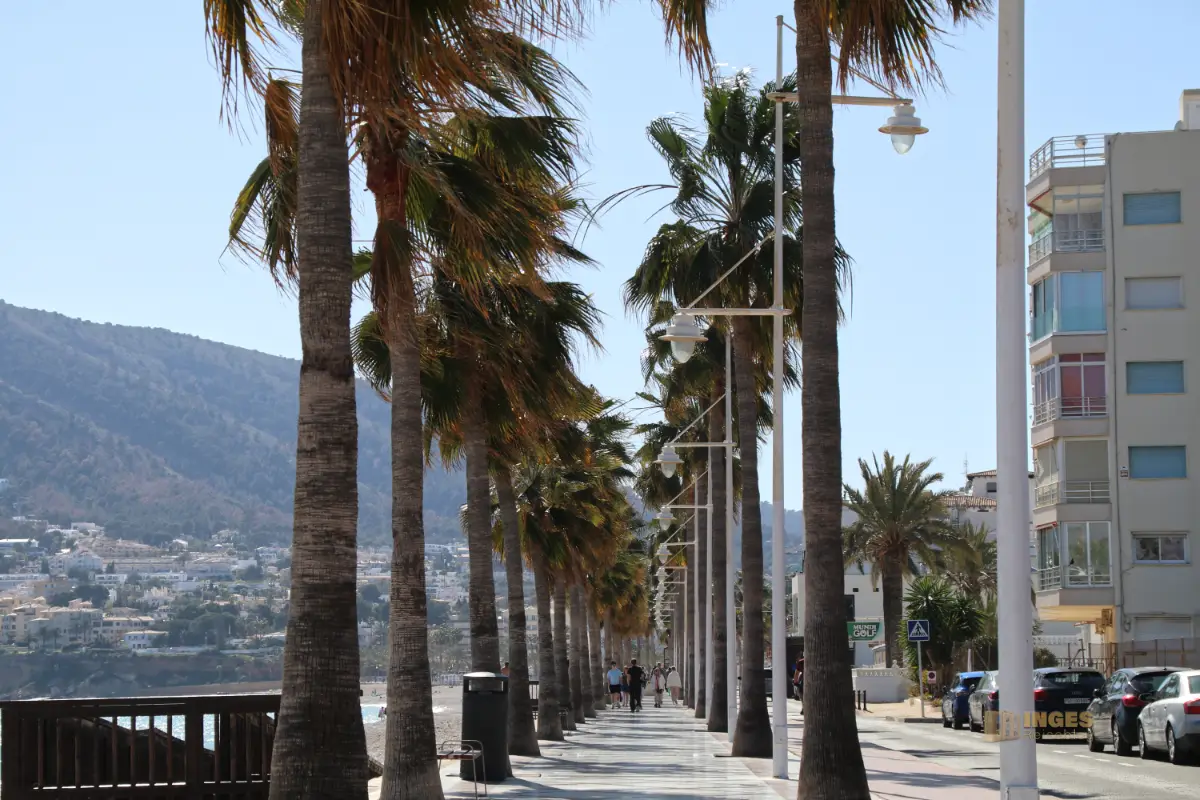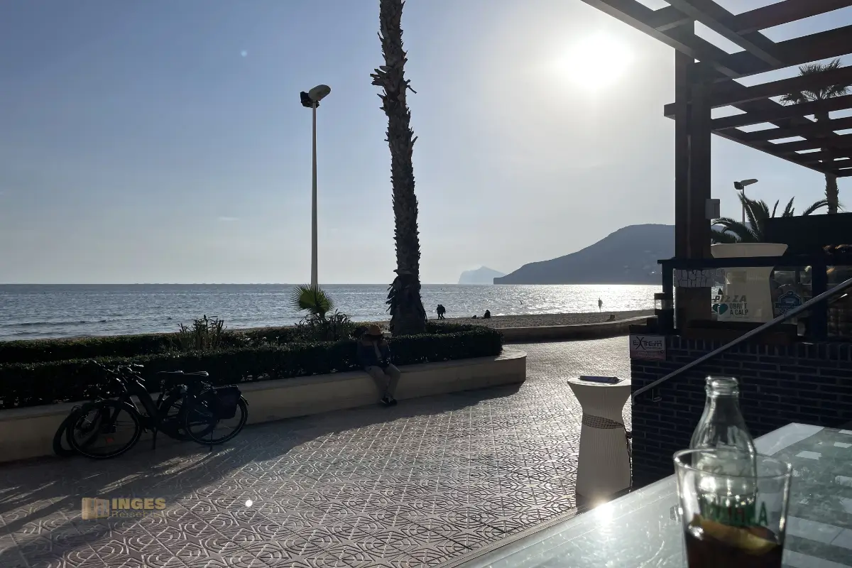 bis nach L'Albir entlang. Eine kleine Straße bringt Rad- oder Autofahrer an ihr Ziel. Links ein mit Palmen gesäumter Fußweg, rechts davon liegen Restaurants und Cafés mit direktem Blick aufs Meer.