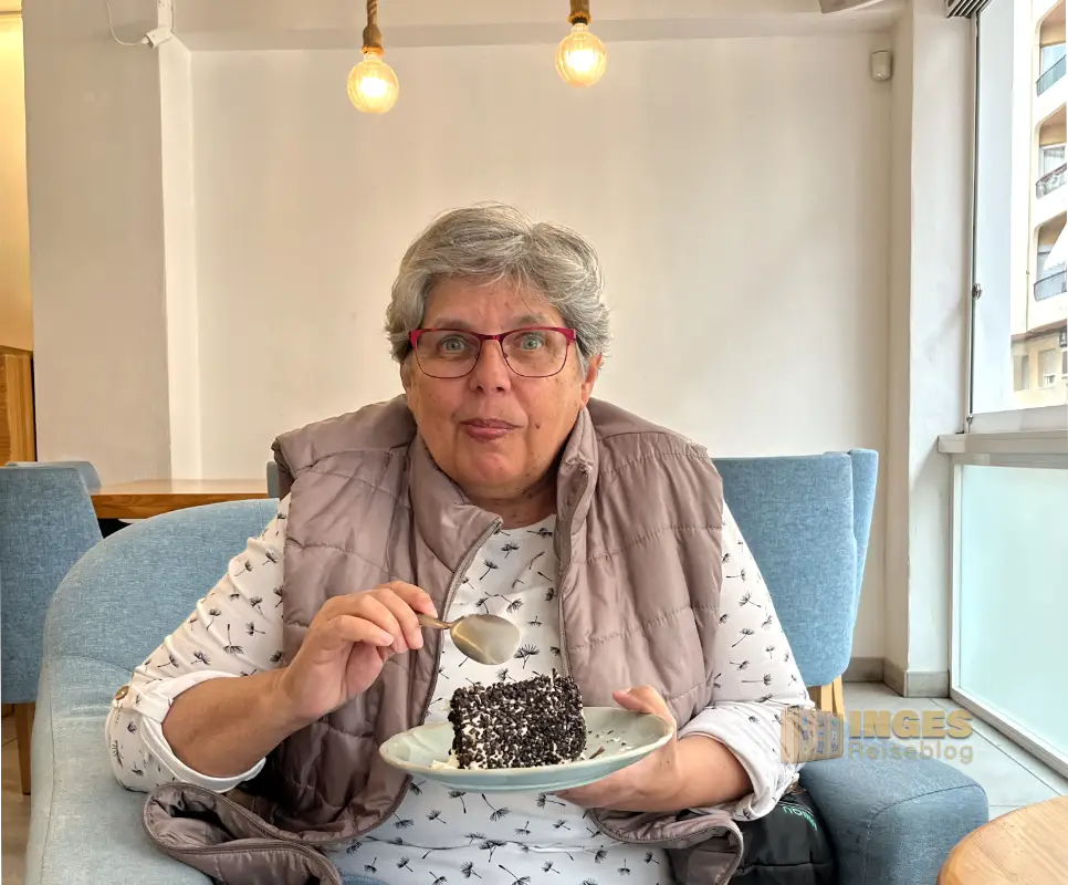 Deshalb sind wir am Nachmittag los Richtung Stadt. Auf 'unserem' Parkplatz bekam Fridolin sein Plätzchen und wir sind den kurzen Weg Richtung dem Strand Arenal-Bol in Calpe. Auf diesem Weg liegt ein Café, in das wir jedes Mal beim Vorbeigehen einen Blick geworfen haben. Natürlich auch auf die leckere und reichhaltige Kuchentheke, die direkt hinter dem Fenster aufgebaut war. Doch jedes Mal waren die Plätze im Café belegt. Heute aber scheint unser Tag zu sein - es sind noch freie Tische erkennbar, und die Kuchenauswahl ließ den Zahn tropfen. Nichts wie rein. "Black forest" an der Costa Blanca. Nein, ich brauch keine heimischen Speisen im Urlaub, aber diese Schwarzwälder Kirschtorte hat mich dann doch richtig heftig angelacht.