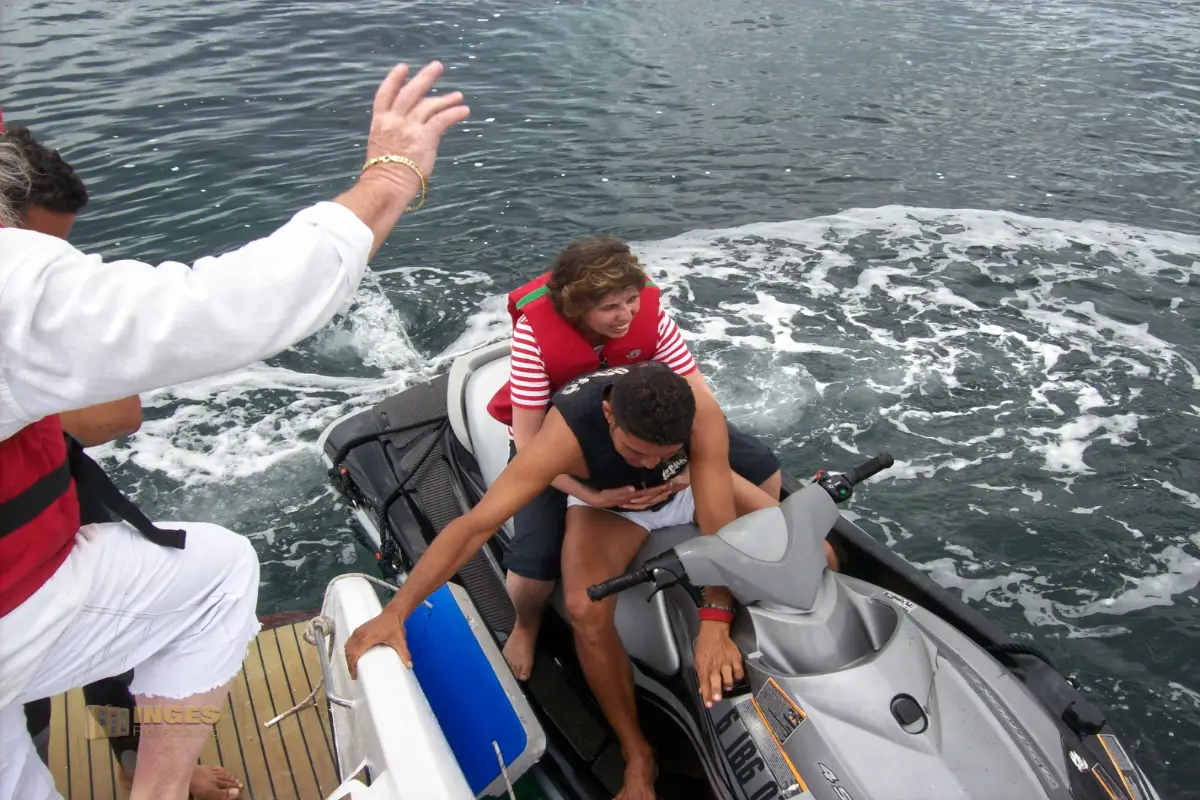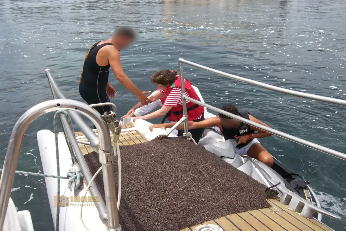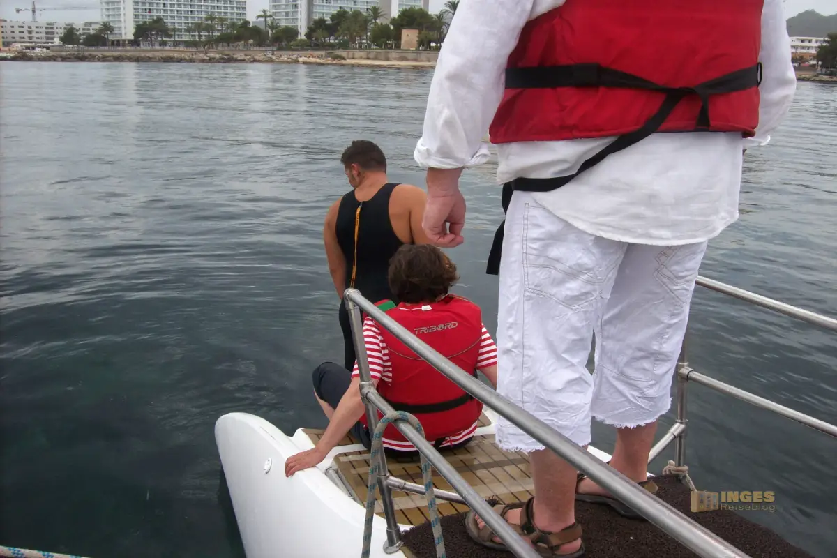 Ich habe mir nichts dabei gedacht, weil das Schiff einen Jetski hinter sich her zog. Solange ich da nicht drauf soll? Alles gut. Aber bei dem Stopp in der Bucht wurde ich eines Besseren belehrt. Da ich einige nette Menschen während meiner Aufenthalte auf Ibiza kennengelernt hatte, und davon noch weitere an Bord waren, fing der Sprechchor an: "Inge, du bist als Nächste dran!" Ich? Nieeeeemals, nein. Ich hatte zuvor beobachtet wie der Fahrer im Tempo durch die Bucht rauschte, was hier erlaubt war.