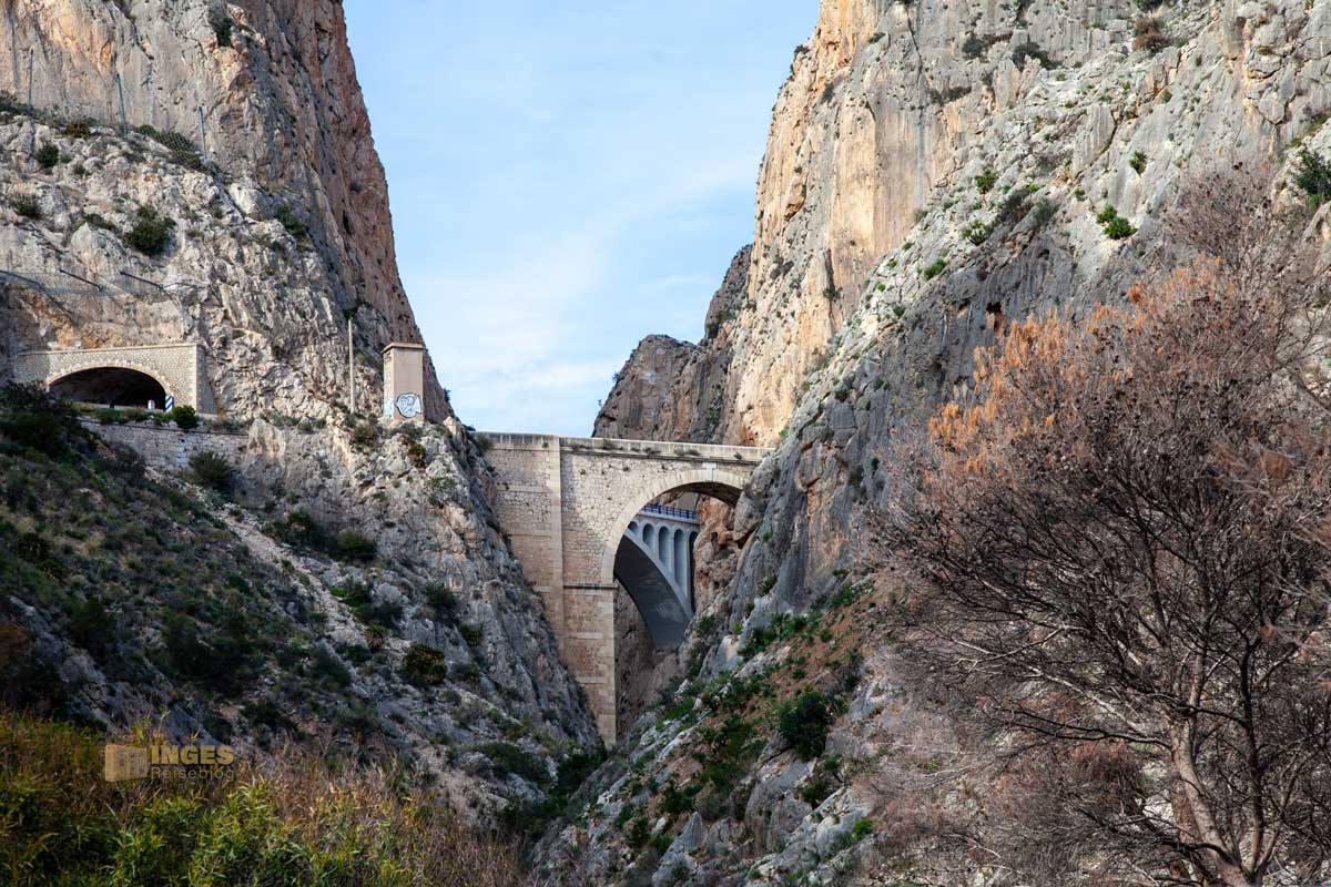 Drei Brücken überqueren die Schlucht, die durch die Kraft des Wassers entstanden ist, das sich durch die Sierra de Bernia den Weg ins Mittelmeer suchte. So entstand ein schmaler Canyon mit hundert Meter hohen Felswänden.
