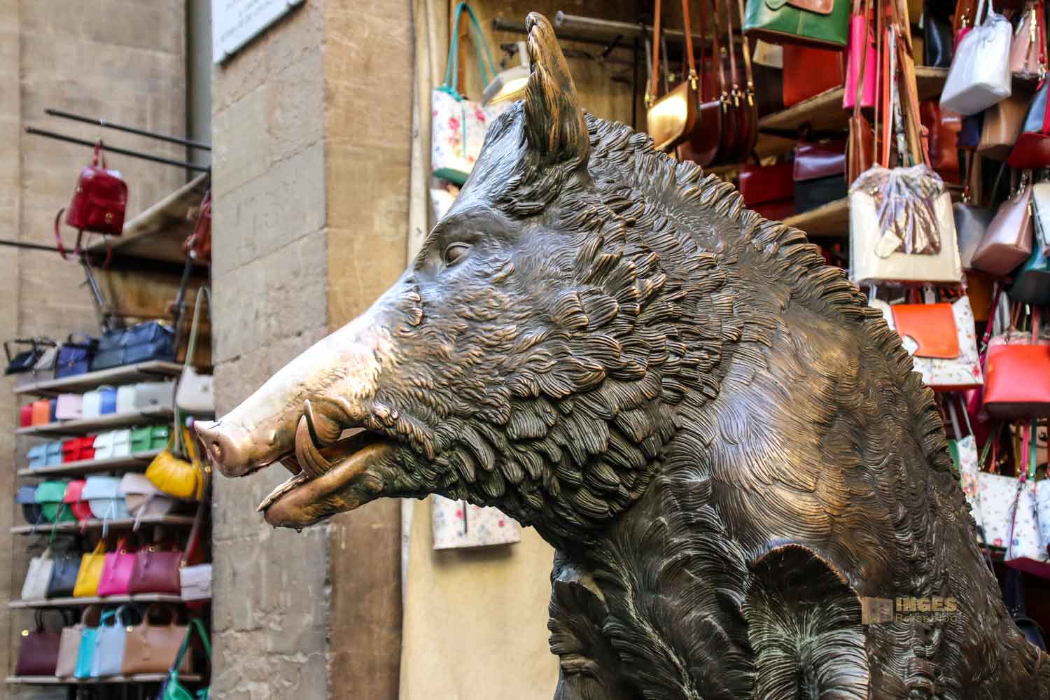 Ein Dauermarkt befindet sich in der Loge des Mercato Nuovo, und am Rand dieses Marktes zog eine Skulptur die Menschen an -