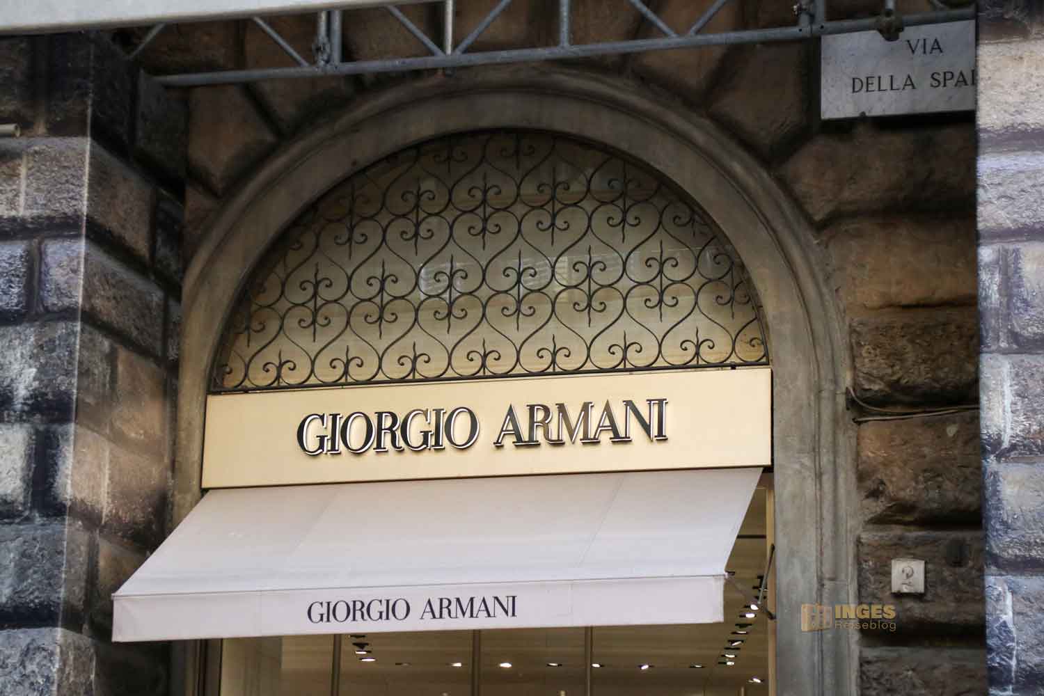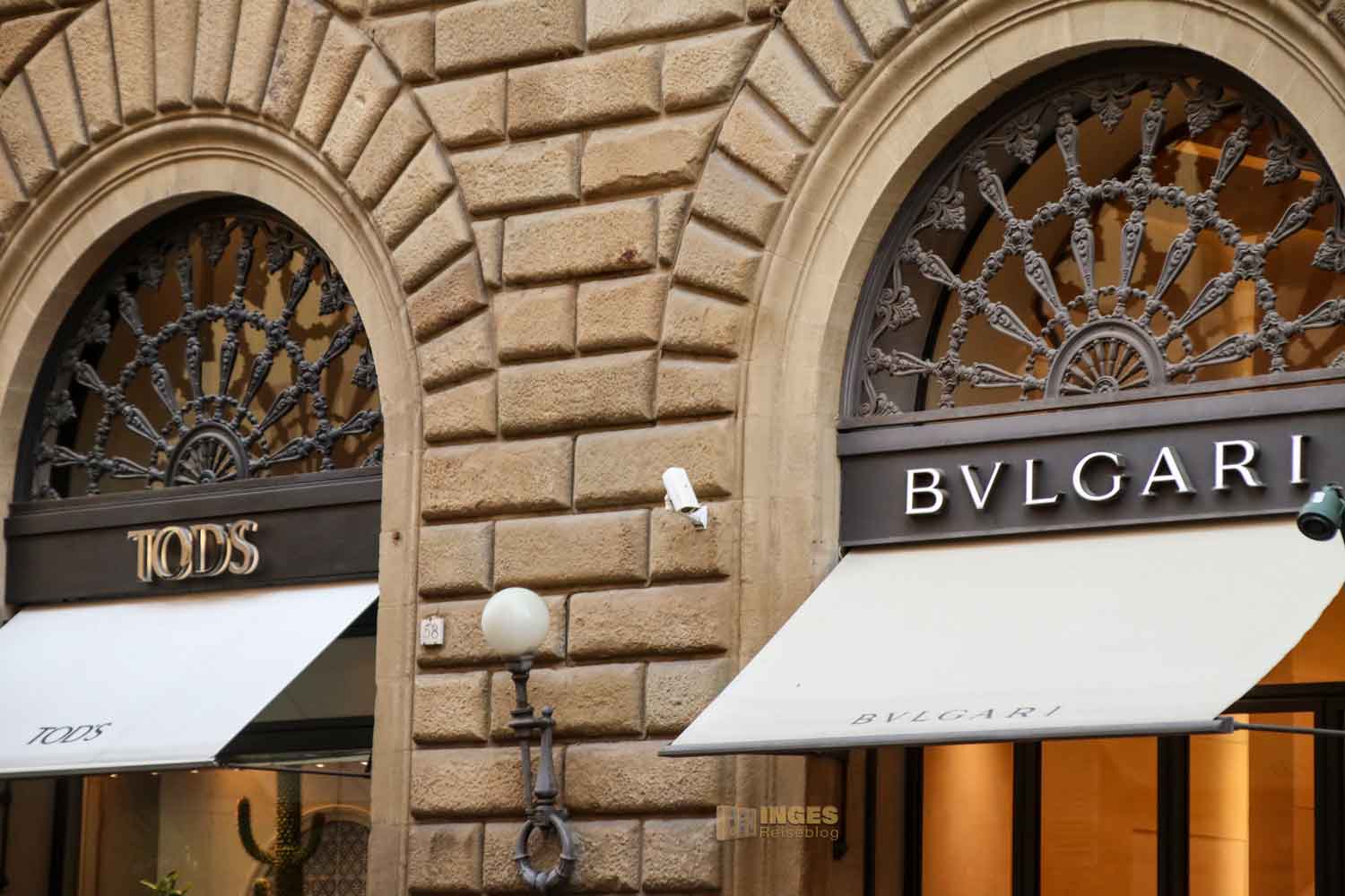 in der man so richtig viel Geld liegen lassen kann. Nein, ich meine jetzt nicht die Schmuckläden auf der Ponte Vecchio, sondern die Via degli Strozzi. Zu beiden Seiten des Palazzo Strozzi, den der Florentiner Kaufmann Strozzi hat erbauen lassen (mehr dazu könnt ihr in meinem ausführlichen Bericht darüber lesen und sehen), reihen sich die Nobelmarken wie an einer Perlenkette auf. Manchmal kaum wahrnehmbar, manchmal offensichtlich herrscht Security über den Eingangsbereich.