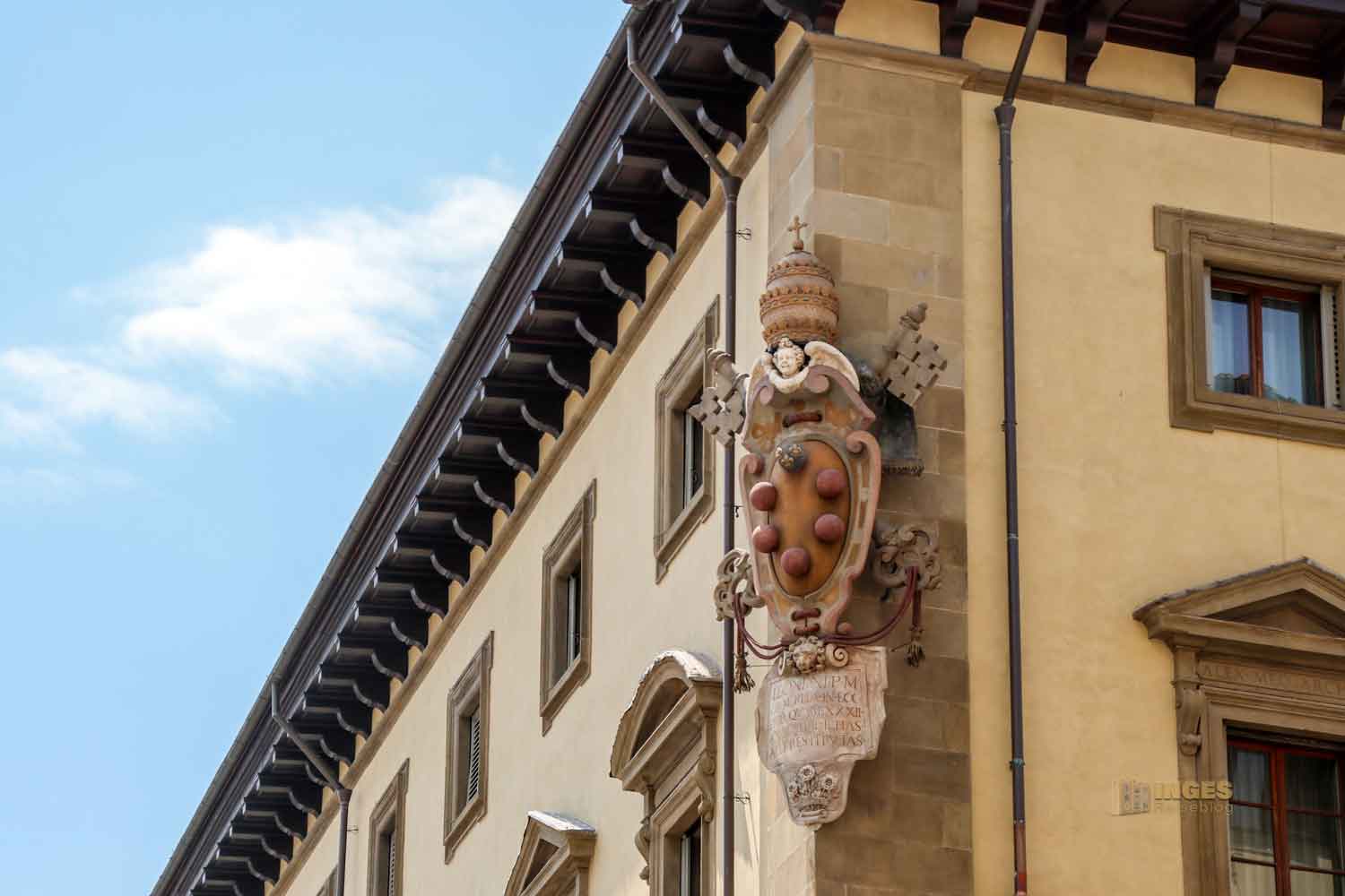 jener Familie, die über 300 Jahre die Stadt bestimmte, förderte, grandiose Bauwerke errichten ließ und in Florenz die Renaissance geprägt hat. Ihr werdet sie in meinen Berichten noch näher kennenlernen. Ihr Wappen hat eine besondere Form, die man nur in Italien findet. Fünf rote Kugeln auf Gold (oder auch nur auf Stein) - und man erkennt sofort, wer seine Finger mit im Spiel hatte.
