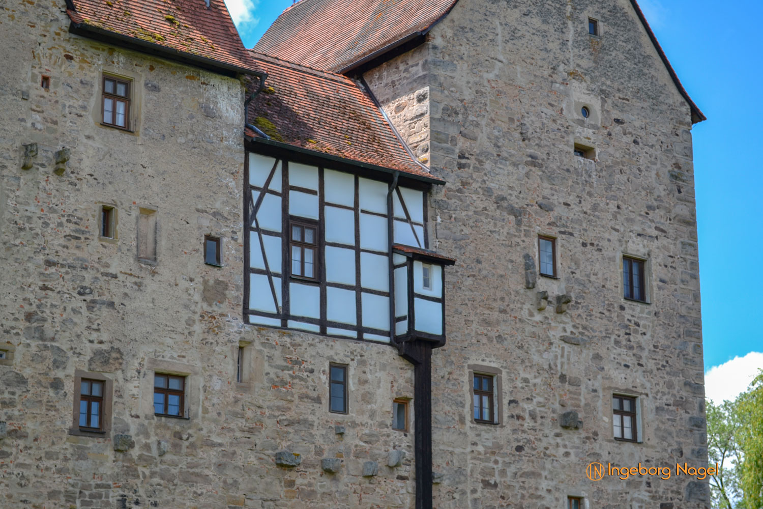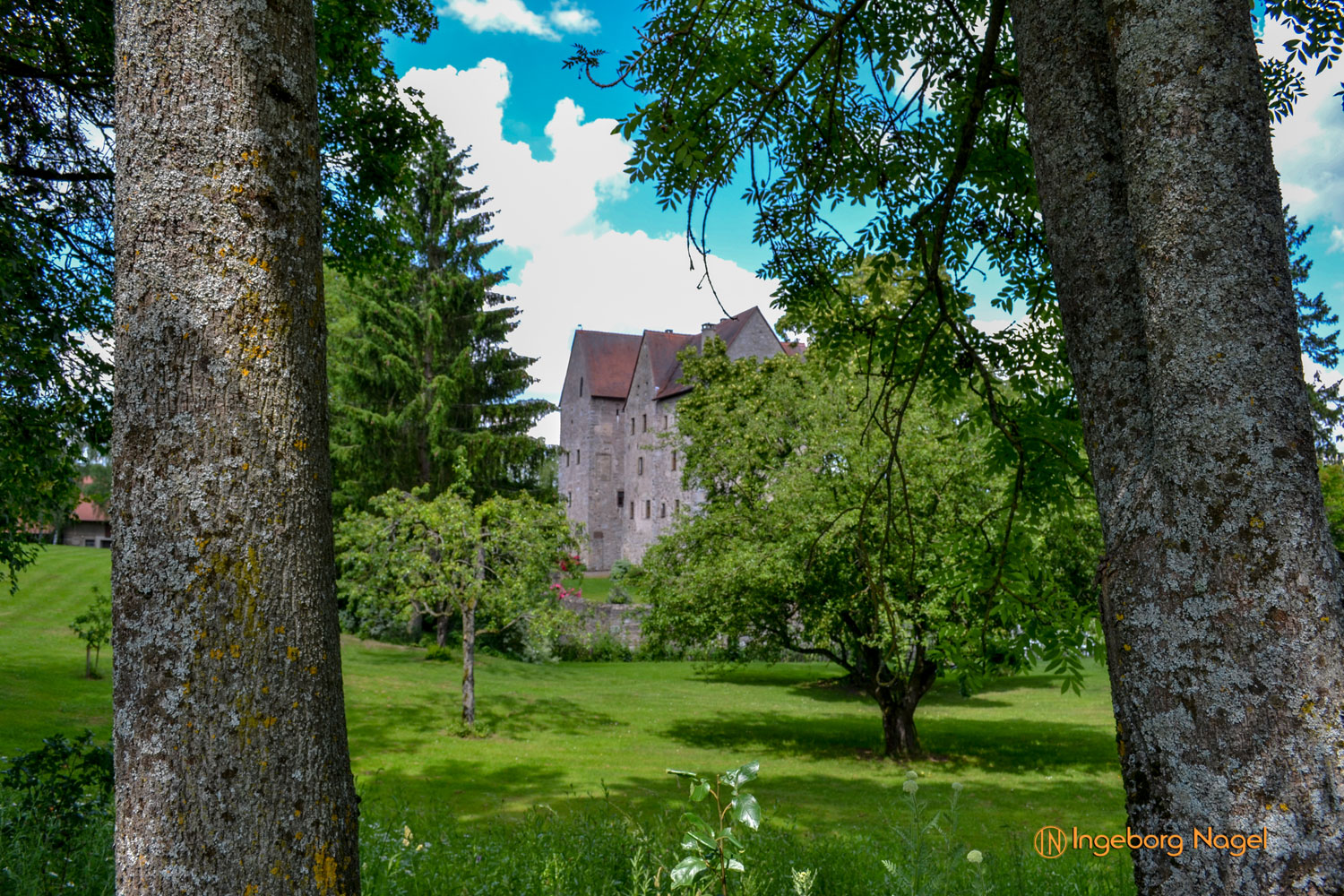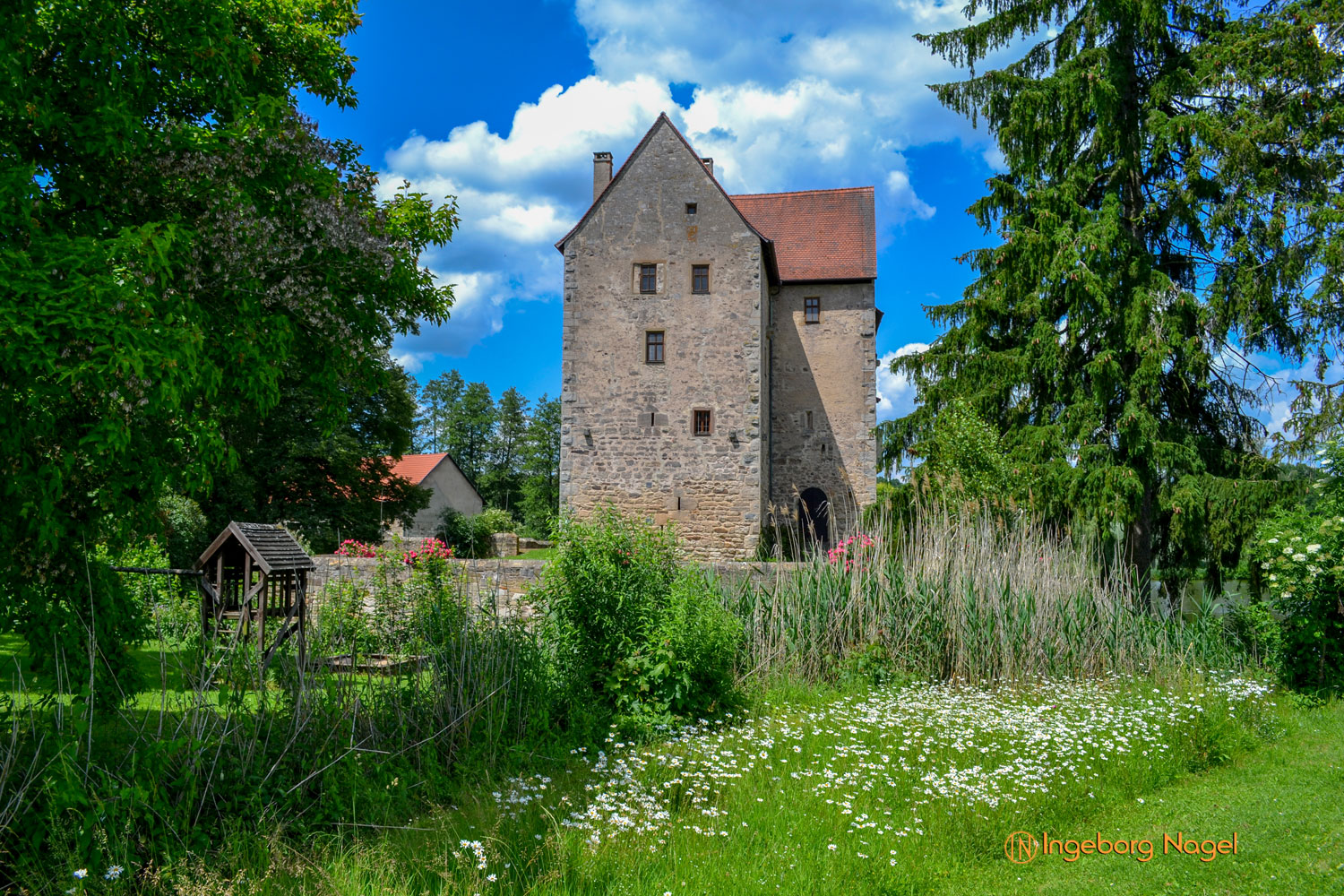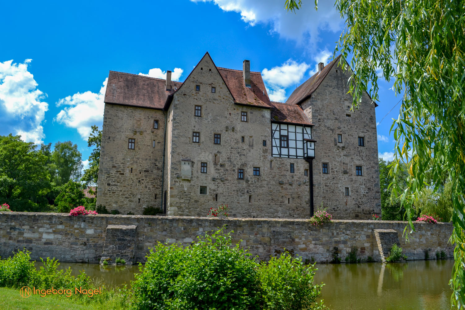 Fast versteckt findet man das Wasserschloss über eine kleine Straße die von Sulzdorf an der Lederhecke abzweigt. Vorbei an einem kleinen Feriendorf am Reuthsee führt die schmale Zufahrt durch Wiesen und Wald. Achtung, langsame Fahrweise ist vorteilhaft, knapp vor mir wechselte an diesem Nachmittag ein Reh die Waldseite.