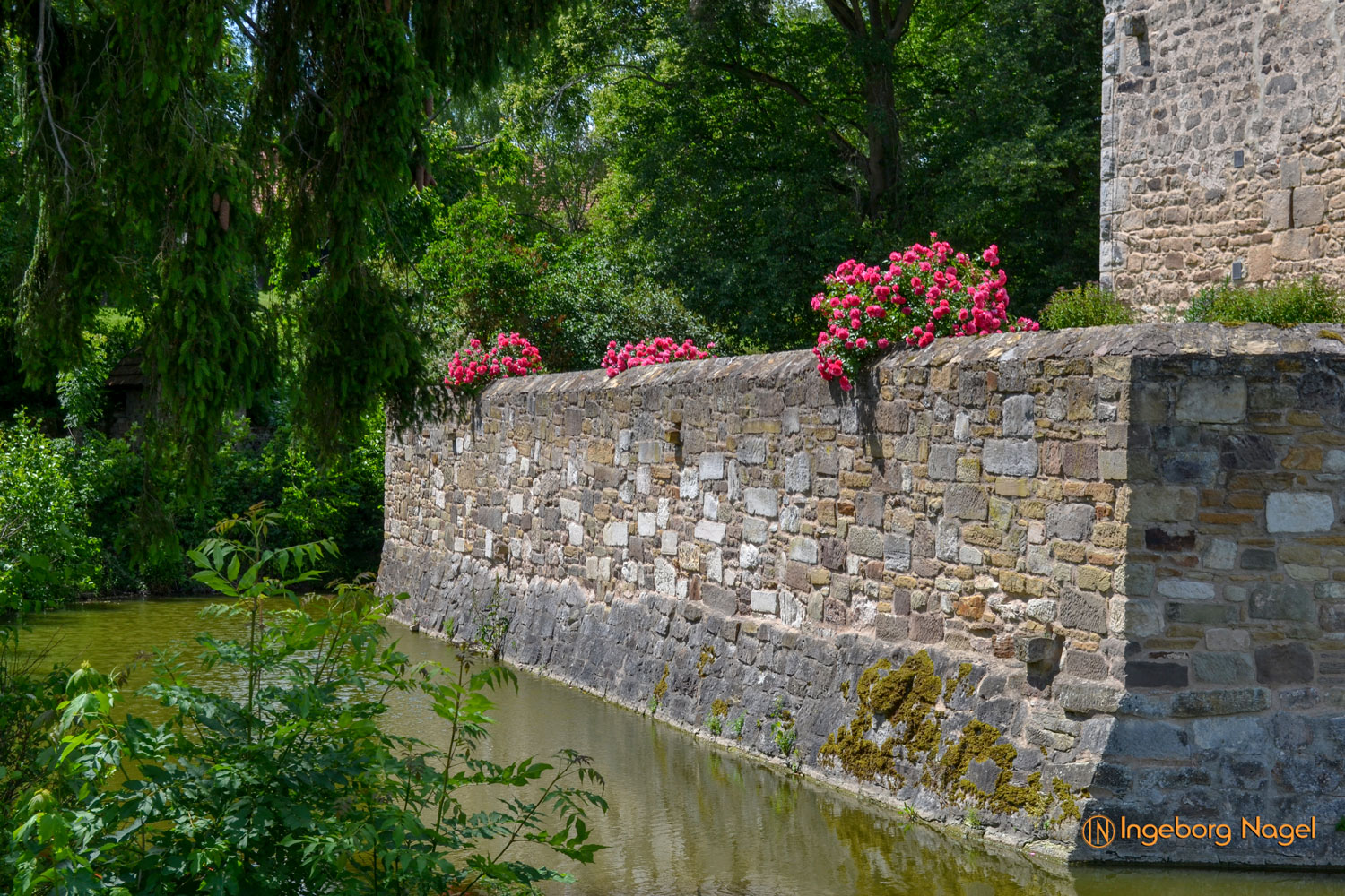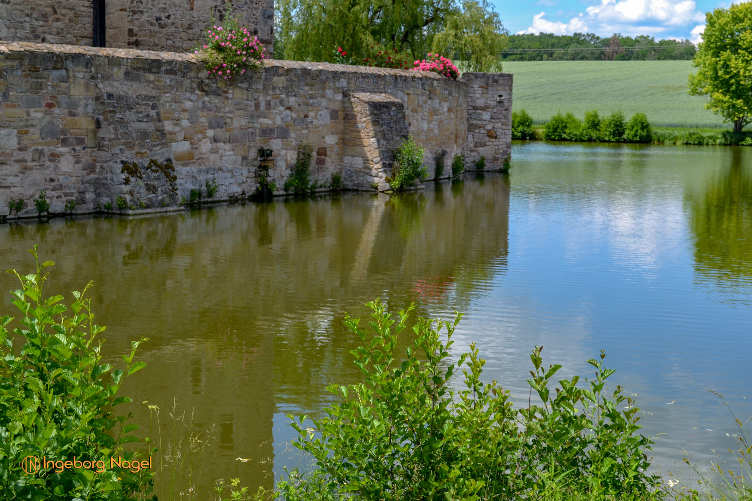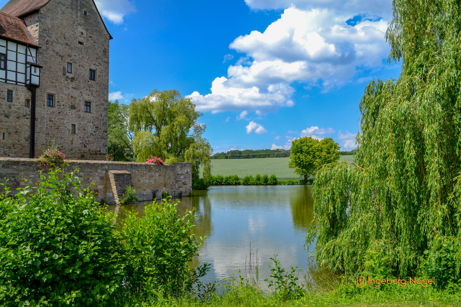 Am Ende der Straße liegt fast versteckt das Wasserschloss, das man nur von der Wassergrabenseite und auch nur von außen besichtigen kann. Ein kleiner See auf der gegenüberliegende Seite stimmt auf das Schloss ein.
